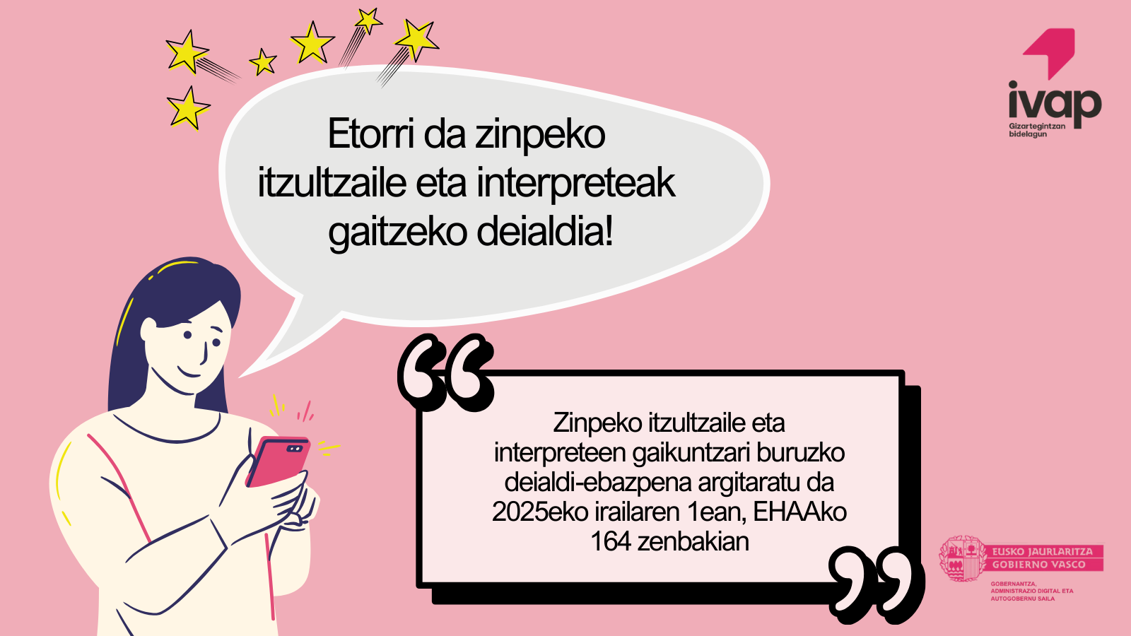 Zinpeko itzultzaile eta interpreteen gaikuntzari buruzko deialdi-ebazpena argitaratu da 2025eko irailaren 1ean, EHAAko 164 zenbakian.