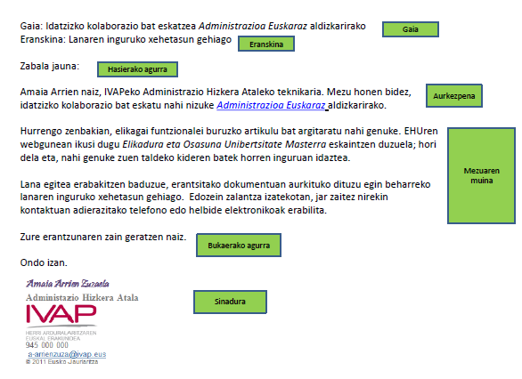 Pertsona horrekin komunikatuko zaren lehenengo aldia bada, edo noizbehinkako harremana badaukazu, aurkeztu ezazu zeure burua. Horrela, hartzaileak izenetik edo komunikazioan betetzen duzun rolarengatik (bezeroa, lankidea, arduraduna…) identifikatuko zaitu.