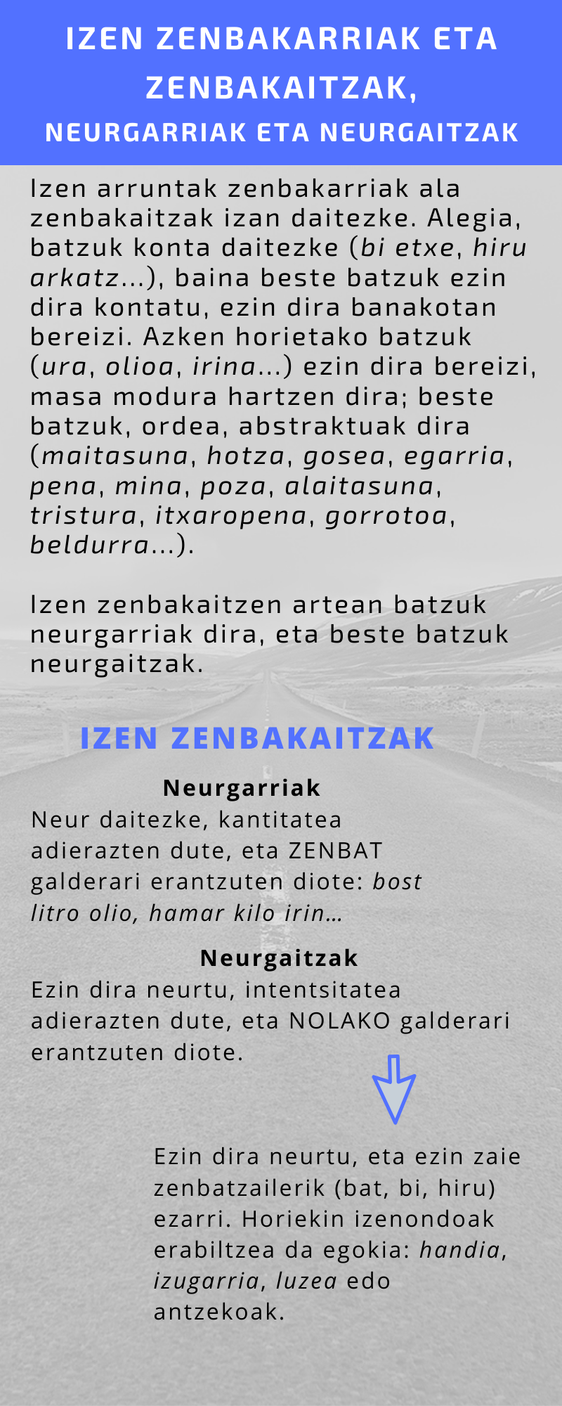 - EUSKALTZAINDIA (1991). Euskal Gramatika. Lehen Urratsak I (EGLU I). Bilbo: Euskaltzaindia (32-35).