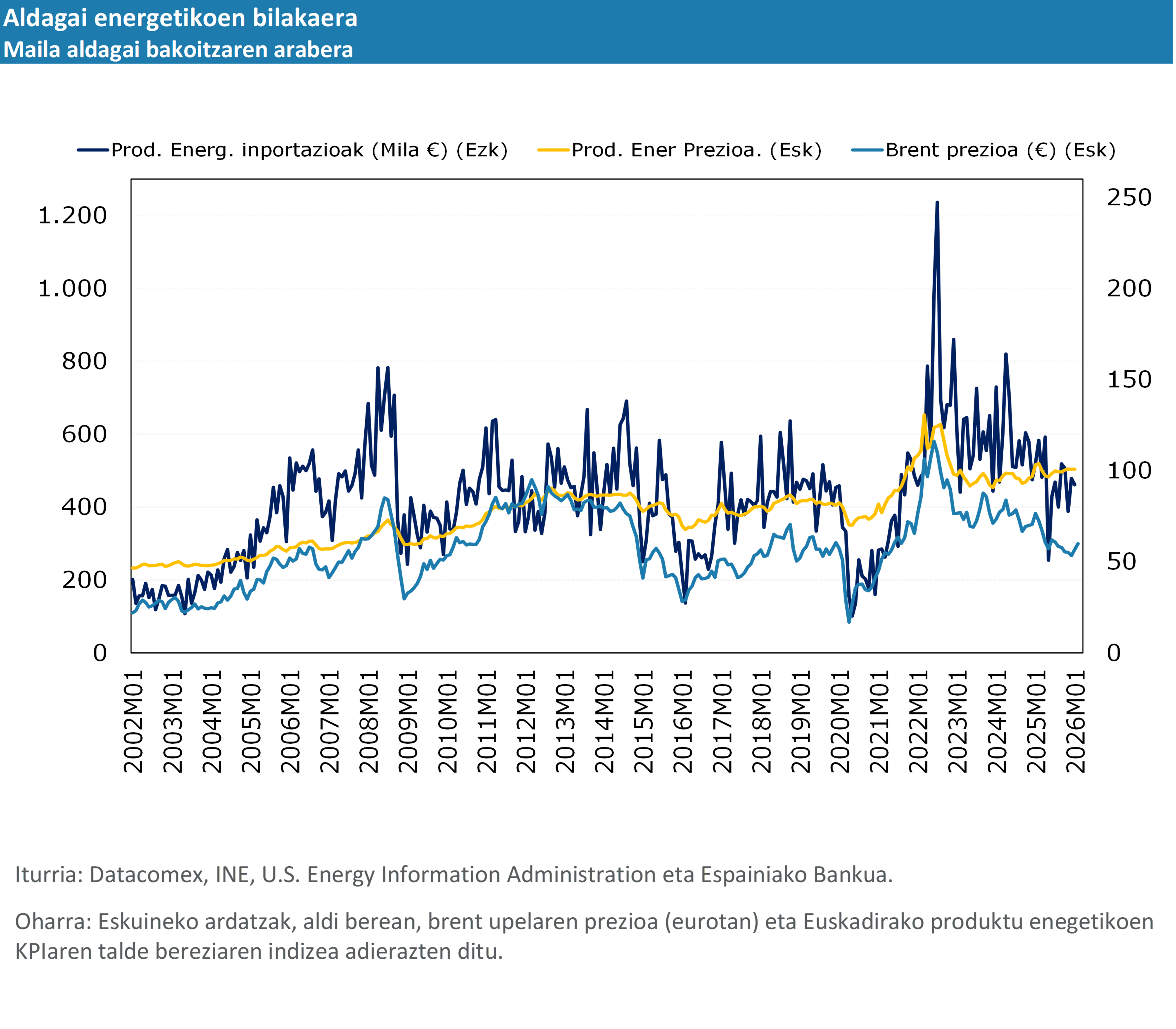 IPRIri dagokionez, 2024an izandako jaitsiera jarraituen ondoren, indizea tasa positiboetara itzuli zen urte horretako abenduan. 2025ean, hazkundeak oso maila neurritsuetan mantendu ziren, industriaren prezioen bilakaera jasoaren ildo beretik, energiaren merkatzeak lagunduta. Hala ere, 2025eko abenduan eta 2026ko lehen bi hilabeteetan, energia-prezioen beherakadaren areagotzeak berriro ere balio negatiboetan kokatu zuen indize orokorra, eta inflazio agregatua moteltzen lagundu zuen.