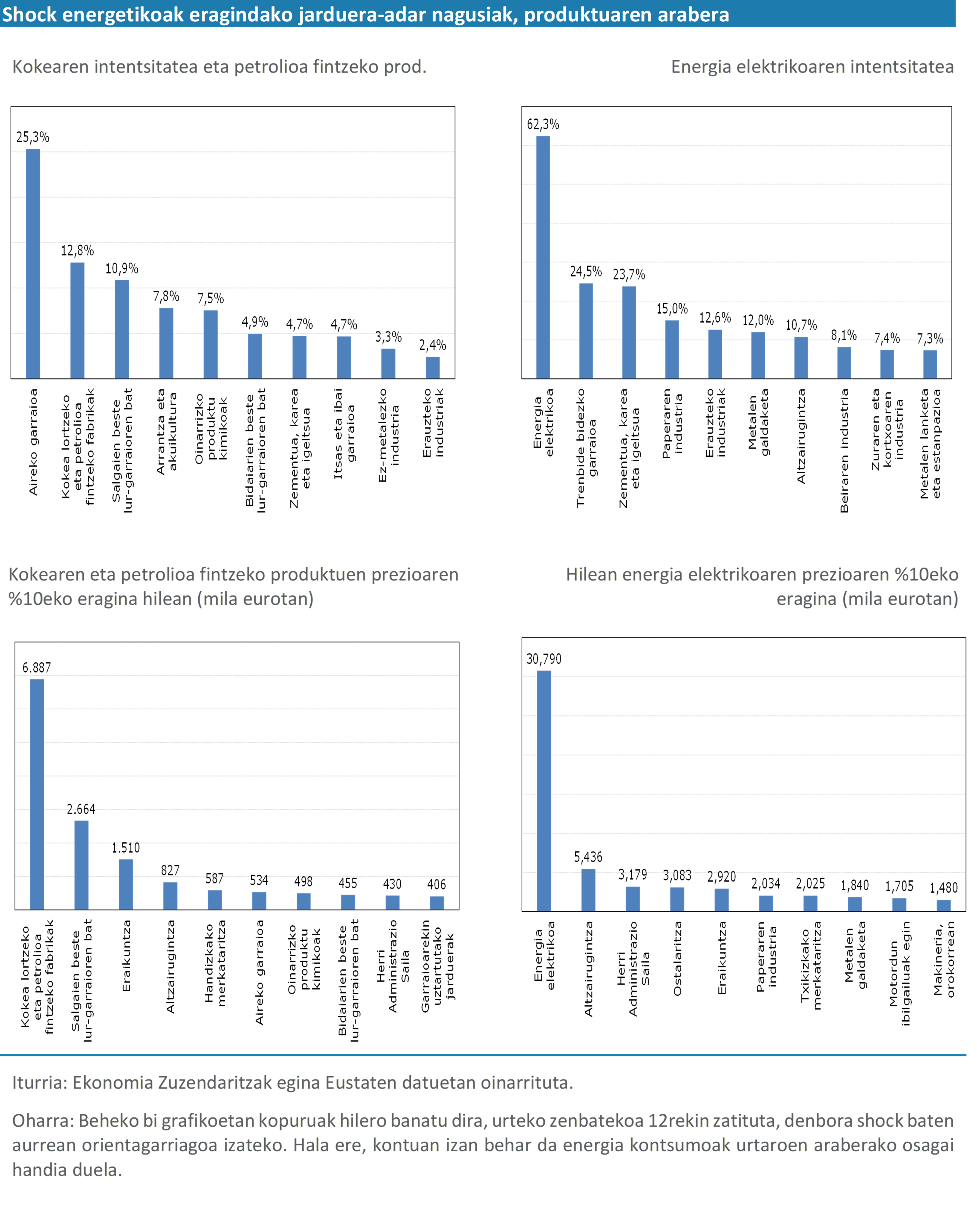 Energia prezioak euskal ekonomiaren jardueretara zein neurritan lekualdatzen diren kalkula daiteke. Maila agregatuan, kokearen eta petrolioa fintzeko produktuen prezioak %10 igotzeak hilean 15 milioi euroko produkzio kostuak handitzea ekarriko luke, eta energia elektrikoaren prezioak %10 igotzeak, berriz, enpresen zuzeneko kostuak 40 milioi euro igotzea ekarriko luke hilero. Beheko grafikoetan, energia intentsitate handieneko hamar jarduera adarrak zehazten dira, petrolioaren produktu finduetan eta energia elektrikoan, eta, beraz, gatazkarako arrisku handiena dutenak, bai termino erlatiboetan (ekoizpenaren ehunekoa), bai absolutuetan (milaka eurotan, inputaren prezioak %10 igotzeko), kontuan hartuta zuzeneko kontsumoa dela beste sektore batzuen ekoizpenaren bidezko bitarteko eskaria.