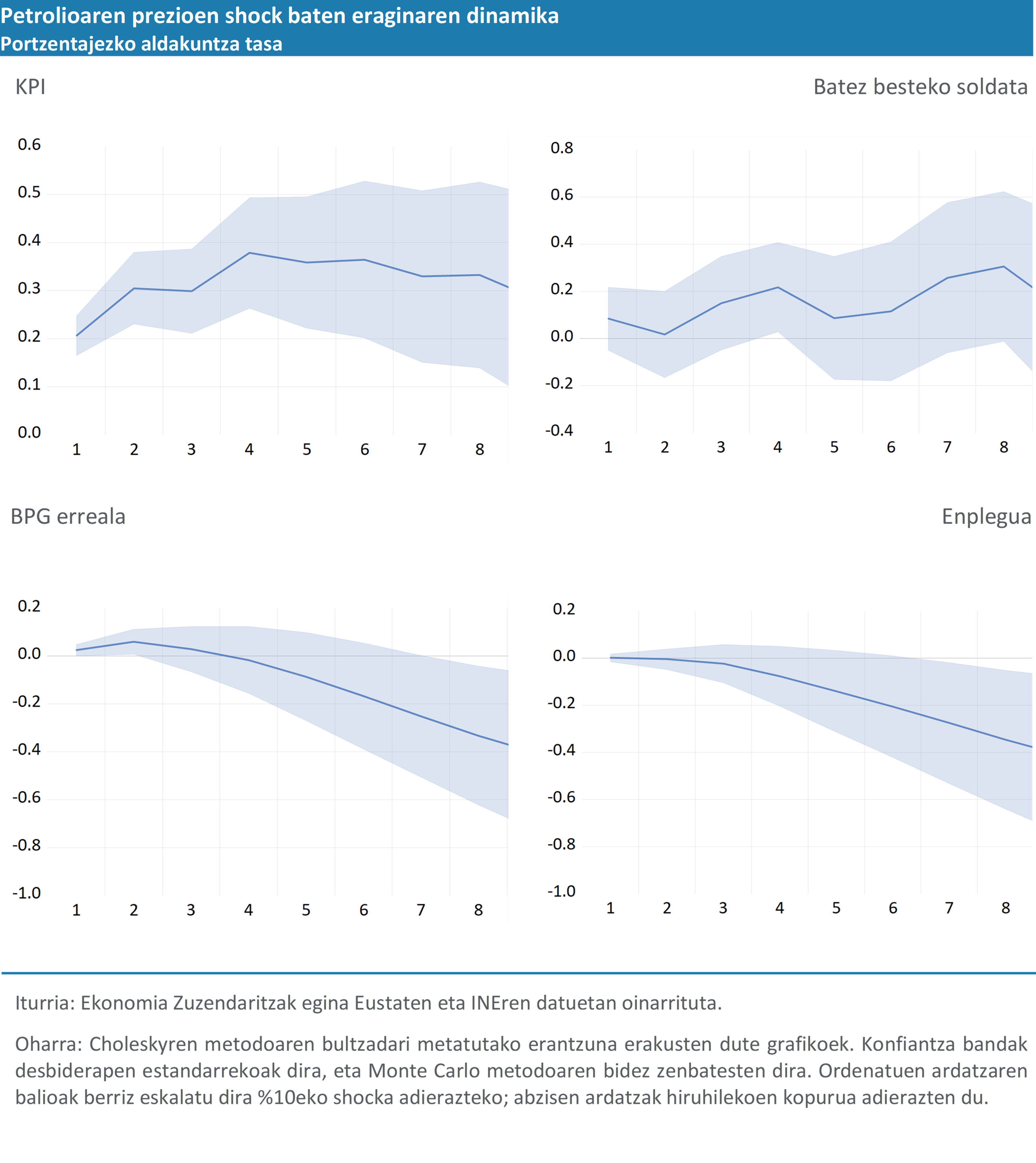 Espezifikazio honek sei aldagai erabiltzen ditu, petrolioaren prezioa, KPI, BPGaren deflaktorea, batez besteko soldata, BPG eta enplegua, produktibitatearen joera koadratikoa irudikatzen duen konstante eta aldagai exogenoarekin batera. Petrolioaren prezioetako shockak gainerako aldagaien balio garaikidearekiko exogenoak direla suposatuz, arrazoizko hipotesiak euskal ekonomiaren kasuan, ereduak shock energetiko iraunkor baten interakzioa eta ekonomia osora hedatzea aztertzeko aukera ematen du. Beheko grafikoetan, bultzada bati (IRF, ingelesezko sigletan) emandako erantzun metatuen balioespenaren emaitzak aurkezten dira hiruhileko bakoitzerako, hasierako shock-etik, eta horrek erakusten du inpaktuak iraun egiten duela aztertutako denbora horizontean.