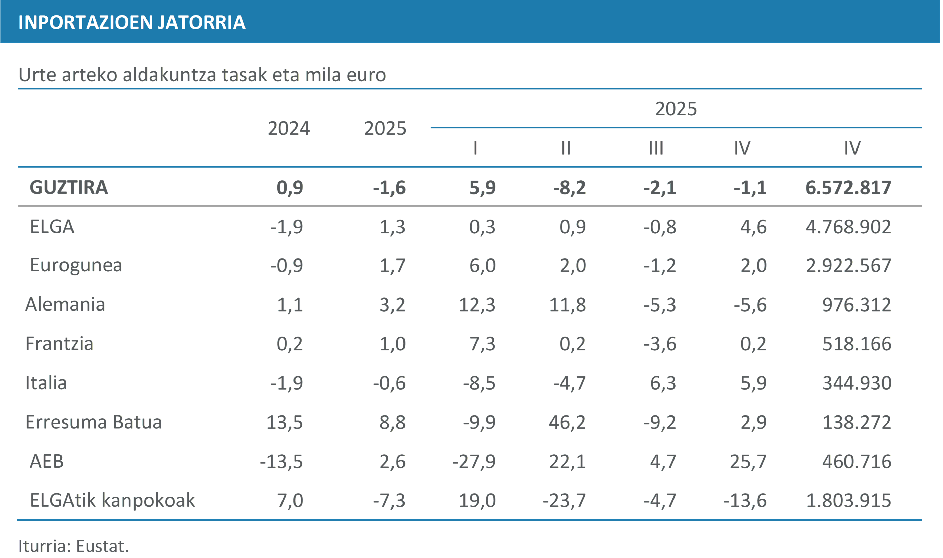 Inportazioek gora beheradun portaera izan zuten 2025ean. Ekitaldiaren hasiera hedakorra izan zen argi eta garbi, %5,9ko aurrerapenarekin lehen hiruhilekoan, baina kanpoko erosketak fase uzkurgarrian sartu ziren udaberrian eta udan, %8,2ko eta %2,1eko jaitsierekin, hurrenez hurren. Laugarren hiruhilekoan, jaitsiera %1,1eraino murriztu zen, eta, ondorioz, urte osoan %1,6 jaitsi zen. Bilakaera hori erregai mineralen atzerakadaren ondorio izan zen soilik, horien inportazioak %17,1 murriztu baitziren. Produktu ez-energetikoak, berriz, %4,2 hazi ziren hiruhilekoan eta %5,3 urte osoan, 21.000 milioi euro ingurura iritsiz, orain arteko mailarik altuenera. Metal arrunten eta horien manufakturen erosketen dinamismoak azaltzen du, neurri handi batean, osagai ez energetikoaren tonurik onena.