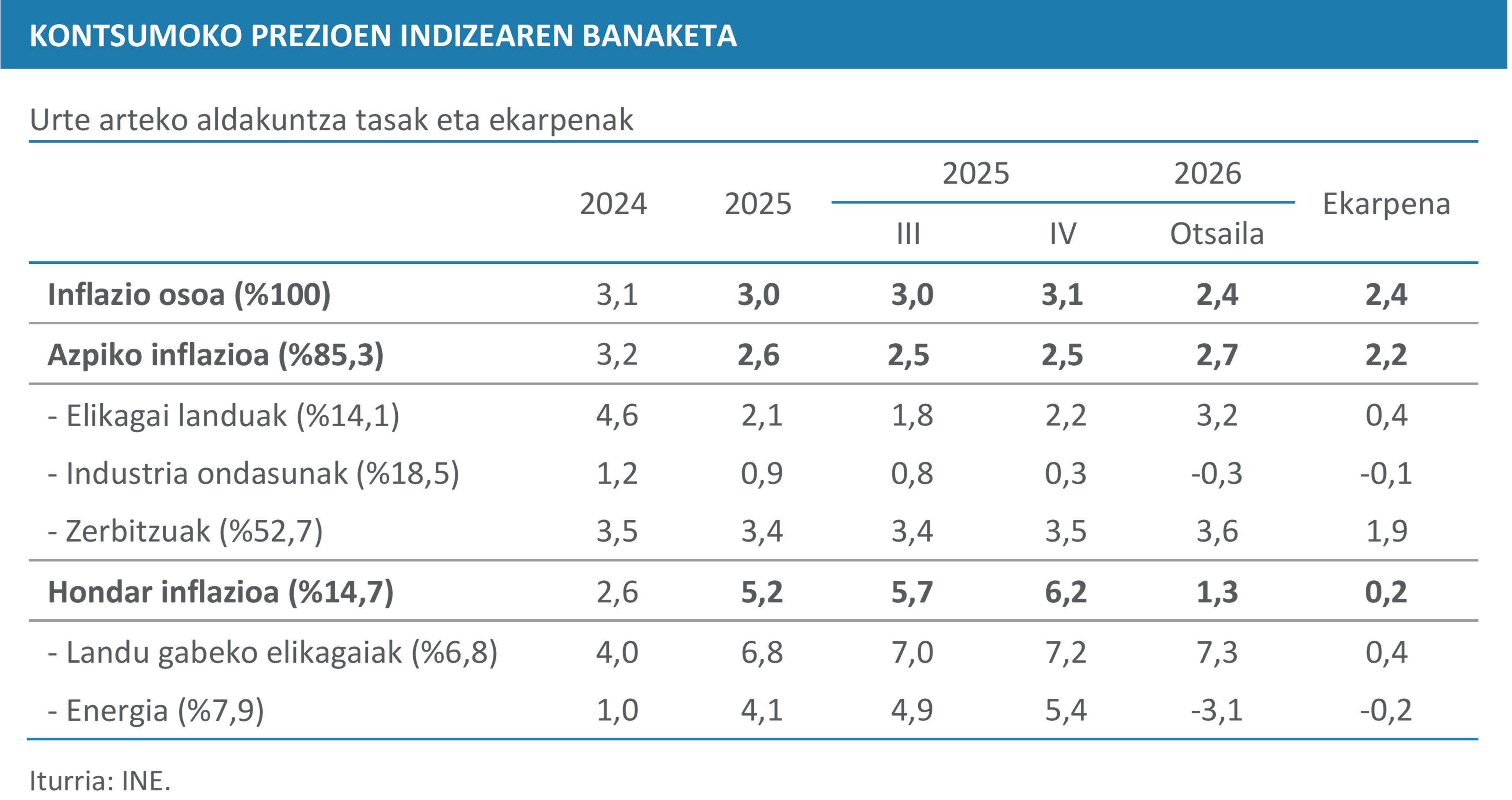 Aitzitik, hondar inflazioak bilakaera nabarmen aldakorragoa erakutsi zuen. Produktu energetikoek hasierako garestitze handi batekin, ondorengo zuzenketarekin eta sistema elektrikoaren doikuntzekin lotutako gorakada berri batekin hasi zuten urtea. Ondoren goranzko bide gero eta moderatuagoan aurrera egin zuten eta. 2026aren hasieran berriro merkatu ziren, eta, horrela, urtearen amaieran pilatutako tentsioen faseari itxiera emanez. Bestalde, elaboratu gabeko elikagaiek tasa altu iraunkorrak mantendu zituzten, %8 inguruko gailurrekin, eta horrek energiatik zetorren eragin moderatzailea mugatu zuen eta hondar presioari eutsi zion indize orokorrean. Gainera, Ekialde Hurbileko gatazkaren bilakaerak zalantzazko elementu gehigarri bat gehitzen du, eta, aurreikuspenen arabera, hondar inflazio hori handitu egingo da datozen hilabeteetan.