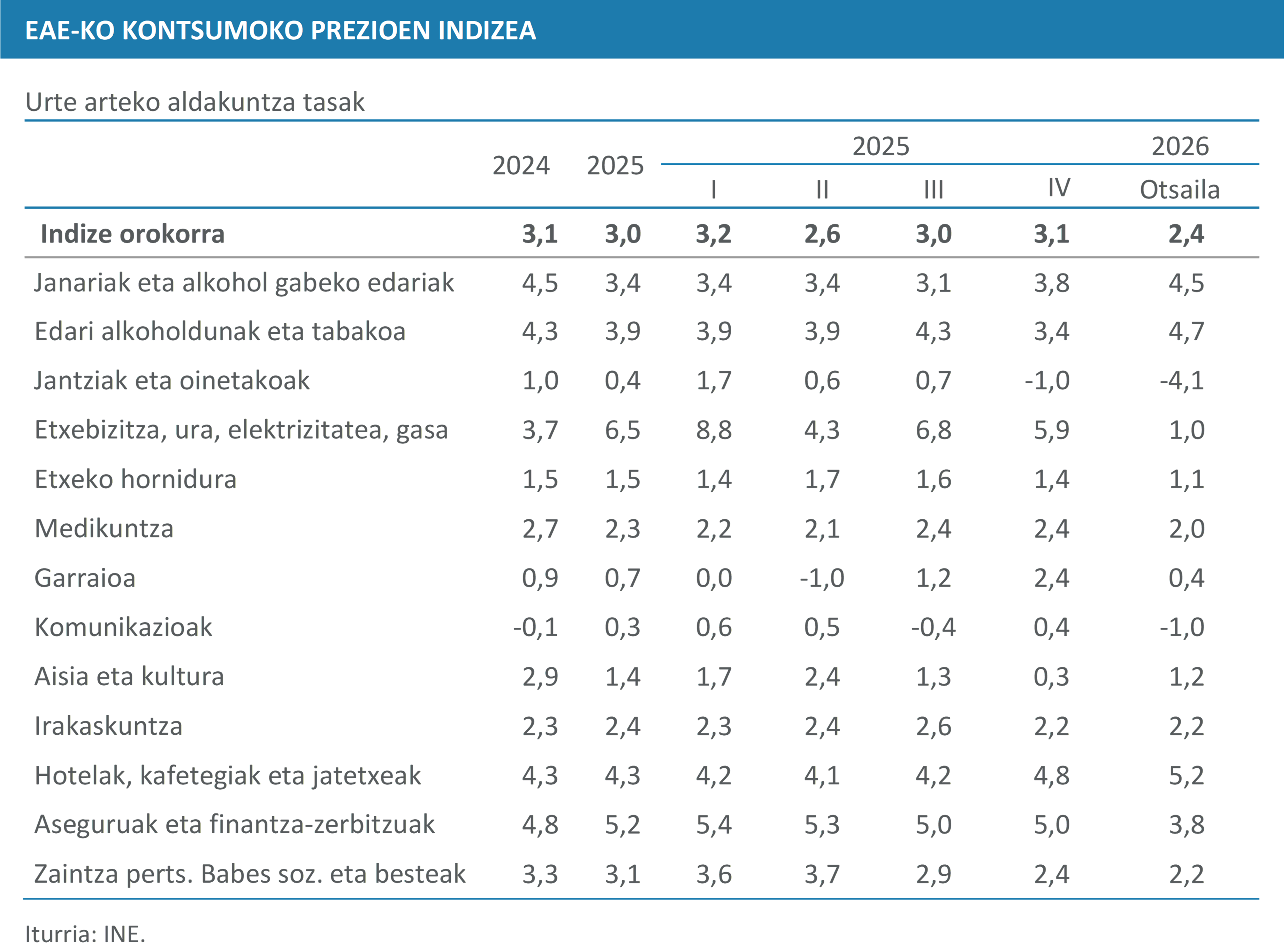 2025ean, Euskadiko inflazio-presioak honako talde hauetan kontzentratu ziren: etxebizitza, ura, elektrizitatea eta gasa (%6,5); aseguruak eta finantza-zerbitzuak (%5,2), primen garestitzean oinarrituta; eta jatetxeak eta hotelak (%4,3). Kontrako aldean, eragin moderatzailerik handiena izan zuten taldeak jantziak eta oinetakoak izan ziren, %0,4ko tasara mugatu baitziren eta garraioa %0,7tasarekin, erregaien portaera erlatiboki egonkorrari esker.