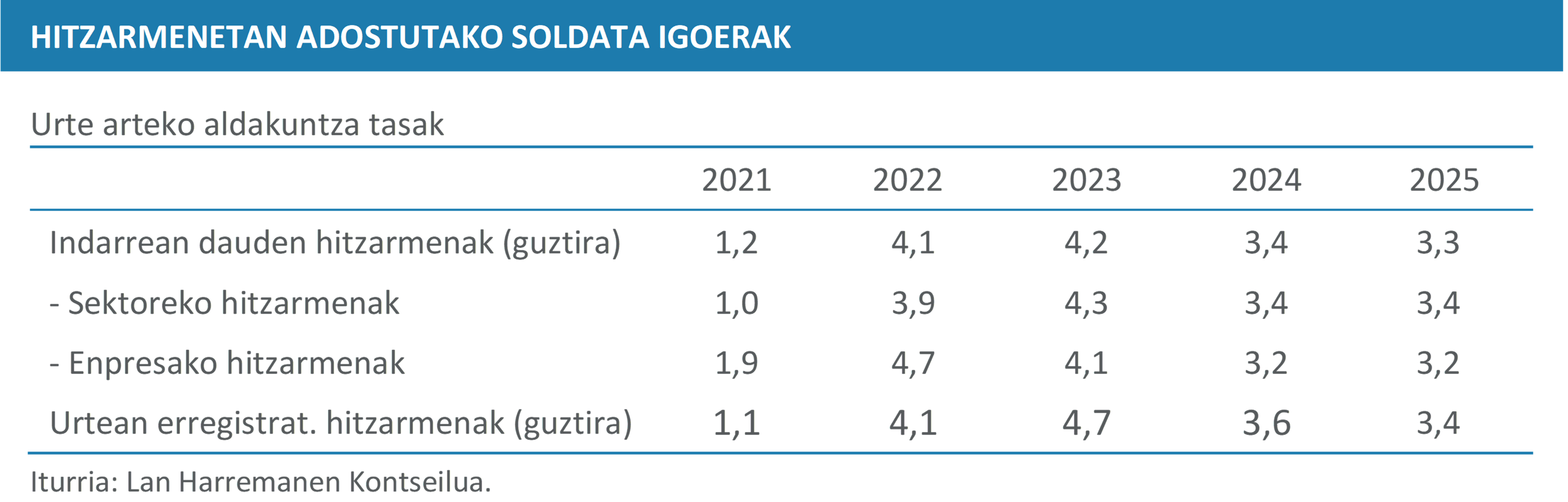 Hitzarmen kolektiboei dagokienez, Euskadik %3,3ko soldata igoerarekin itxi zuen 2025. urtea, hitzarmenean itundutako Estatuko batez besteko soldata igoera (%3,5ekoa) baino zertxobait txikiagoa. Hala ere, erregistro hori inflazioaren gainetik egon zen; izan ere, esan bezala, inflazioak %3,0ko batez besteko hazkundea izan zuen ekitaldian, eta langileek erosteko ahalmena berreskuratu zuten. Soldata igoera hori murrizten joan da aurreko urteekin alderatuta, inflazioa pixkanaka moteldu zelako eta hitzarmenen ehuneko handi bat KPIri lotuta dagoelako. Azkenik, aipatzekoa da 2025ean negoziazio kolektiboak dinamismo txikiagoa erakutsi duela aurreko ekitaldiarekin alderatuta. Urtea ixtean, 415.575 langilek zituzten hitzarmenak eguneratuta, hau da, guztizkoaren %63,8k. Zifra hori 2024an erregistratutakoa baino txikiagoa da, orduan langileen %67,7k baitzituzten indarrean beren hitzarmenak (20.000 langile gutxiago inguruk zuten indarrean hitzarmena aurten). Hala ere, hitzarmenen luzapenari esker, egoerak azken urteetako onenetakoa izaten jarraitzen du; izan ere, langileen %4,5ek baino ez ditu hitzarmenak bertan behera utzi, eta 2024ean bezala mantendu da kopuru hori.