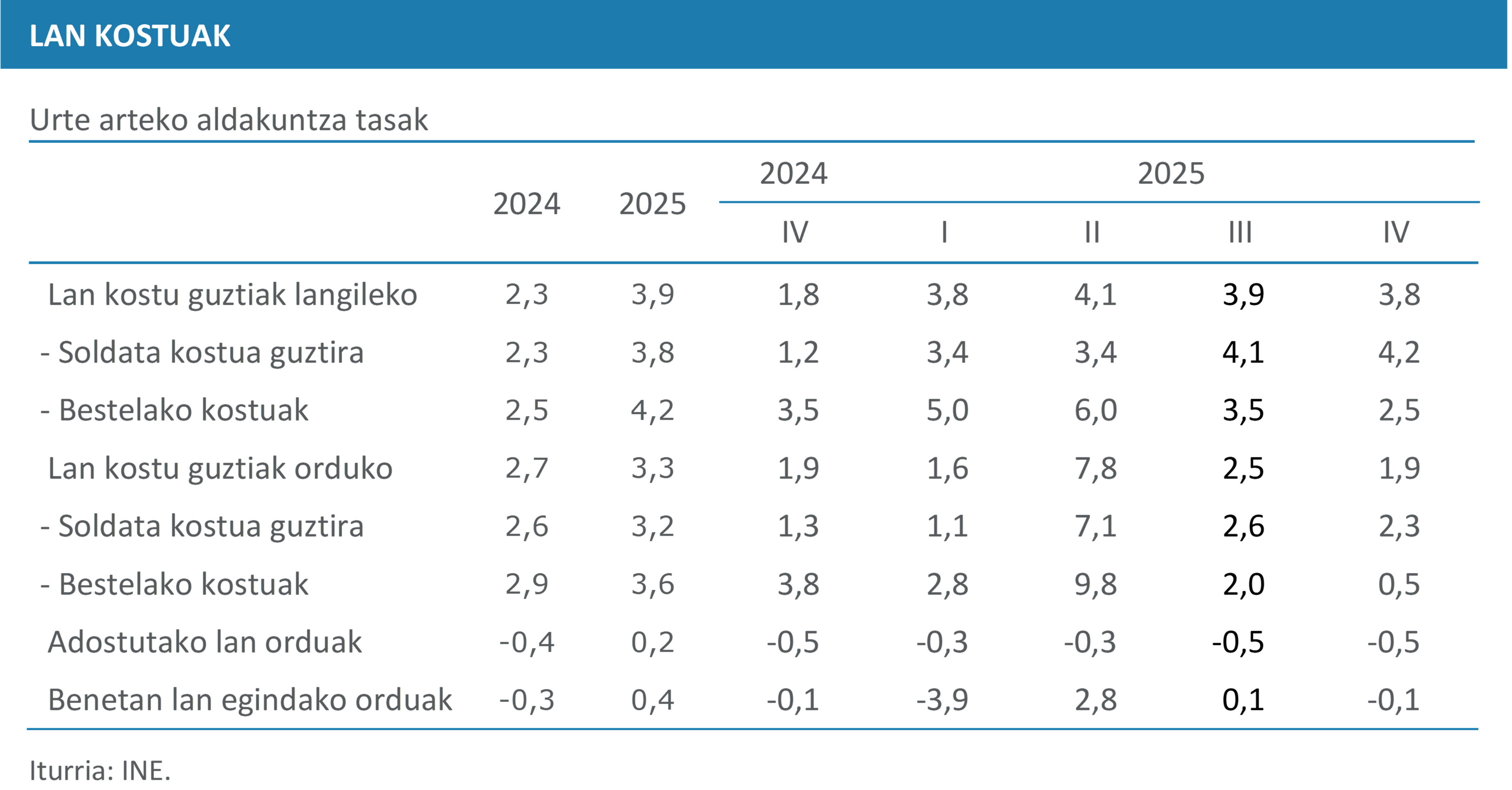 Lan kostuen azterketak erakusten du 2025ean azelerazio bat eman zela aurreko urtearekin alderatuta. Langile bakoitzeko kostuak, lan kostuak zein soldatakoak, gehiago igo ziren, %3,9 eta %3,8 hurrenez hurren, 2024an bientzako erregistratutako %2,3aren aldean. Gorakada are nabarmenagoa izan zen beste kostuetan, horien tasa % 2,5etik % 4,2ra igaro baitzen aldi berean. Lan egindako ordu bakoitzeko kostuei dagokienez, guztizko lan kostuak %3,3 egin zuen gora, aurreko urteko %2,7aren gainetik, eta soldata kostuak eta beste kostuak, berriz, %3,2 eta %3,6raino bizkortu ziren, hurrenez hurren. Langileko eta orduko kostuen hazkunde erritmoen arteko aldea lanaldiaren portaerak azaltzen du; izan ere, 2025ean, bai itundutako orduak bai ordu efektiboak zertxobait igo ziren ( %0,2 eta %0,4, hurrenez hurren), eta 148 ordu hitzartu eta 123 ordu efektibo izatera iritsi ziren.