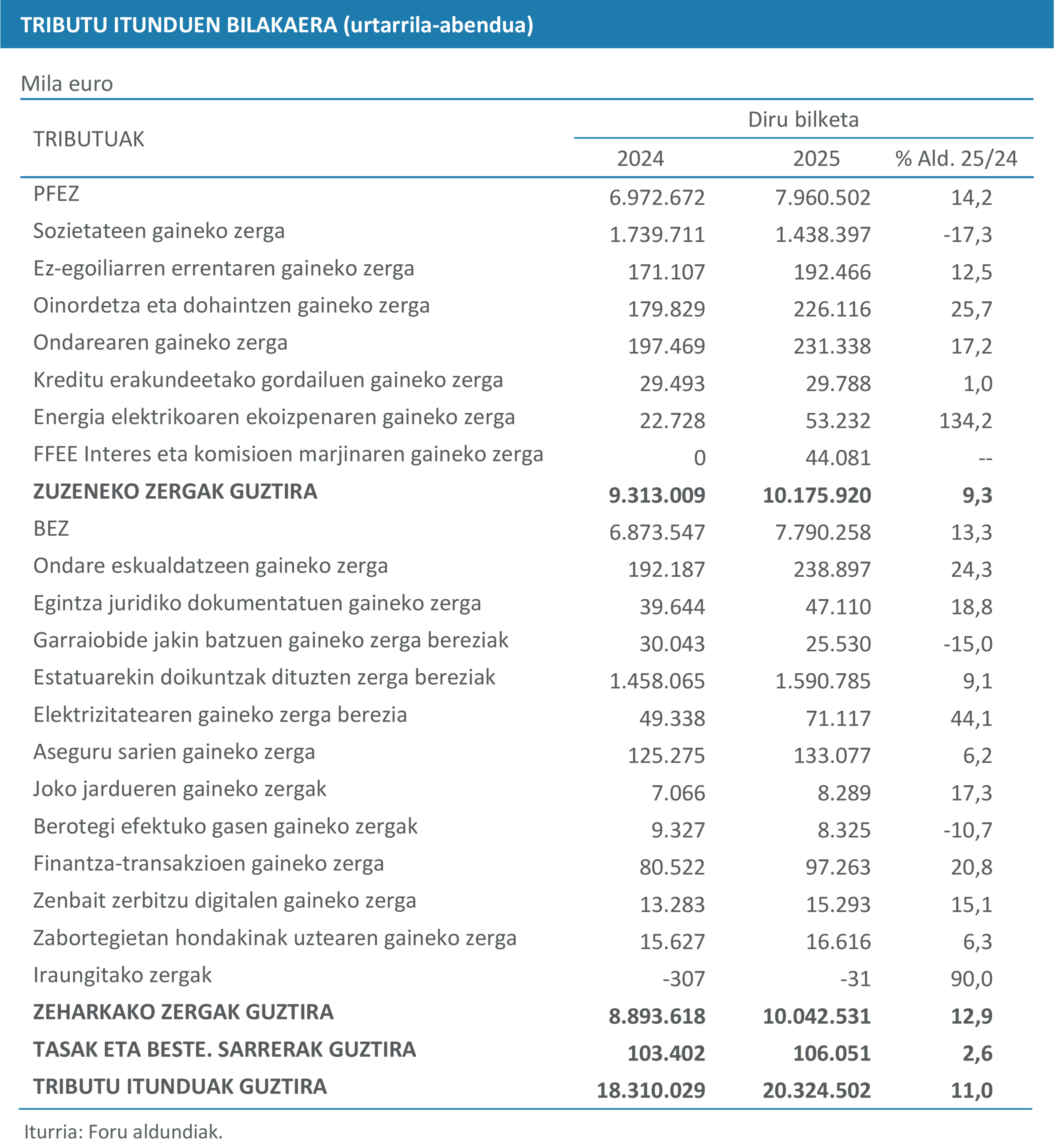 Zuzeneko zergen bidezko bilketa 10.175,9 milioi eurokoa izan zen eta % 9,3 hazi zen, batez ere PFEZk bultzatuta, hau %14,2 hazi baitzen. Aurrerapen hori soldata errenten urte bateko igoerari, enplegu sendoagoari eta hazkundea mantendu zuen jarduera ekonomikoari zor zaio. Aitzitik, Sozietateen gaineko Zergak beherakada nabarmena izan zuen 2025ean (−%17,3), diru bilketa beherantz bultzatu zuten faktore konbinazio baten ondorioz. Nabarmentzekoa da zergadun handiek ekarpen txikiagoa egin dutela, eta BGAEen itzulketak handitu egin direla aitortutako emaitzak murriztuz. Horri gehitu behar zaizkio ekitaldi honetan zerga oinarri negatiboen erabilera zabalagoa ahalbidetu duten arau-aldaketak bai eta ziklo esportatzailearen eragin daukaten jardueren ahultasuna ere, bereziki energia eta automobilgintza. Gainera, urte arteko konparazioa 2024an sozietate kontzeptu bidezko diru bilketa bereziki handiak baldintzatzen du.
