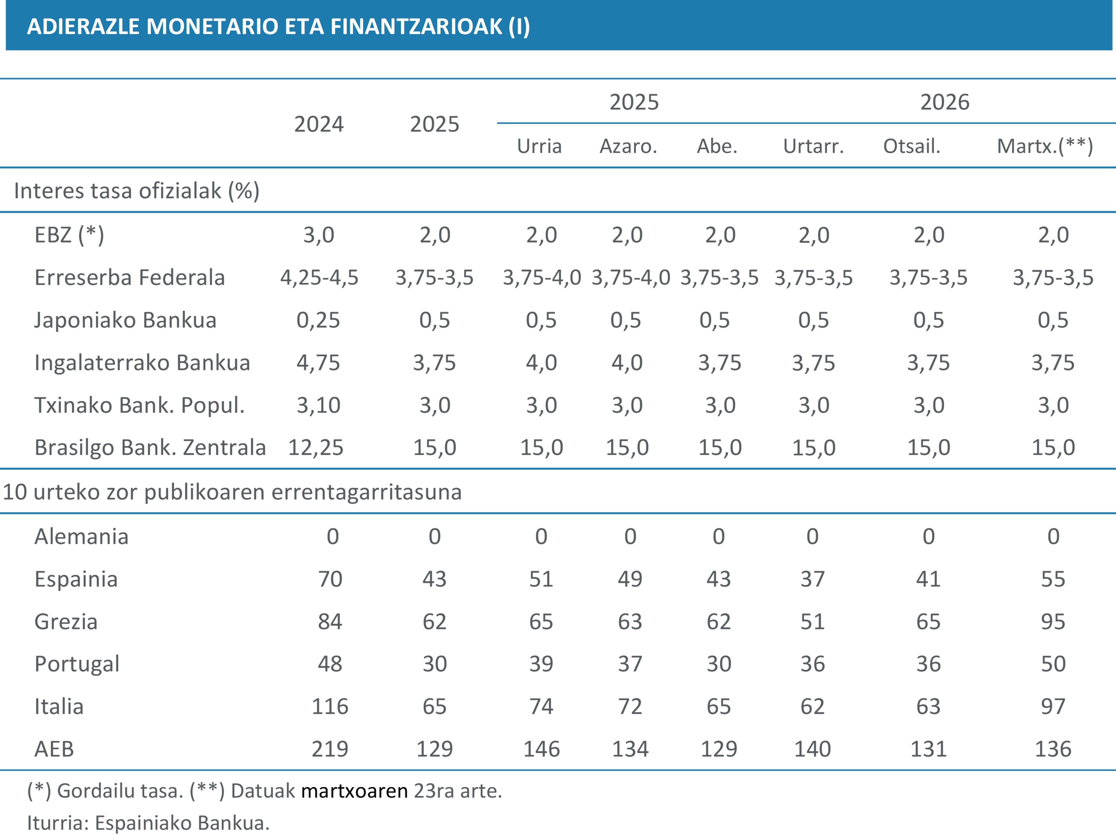 Euroguneko inflazioak %2,5 inguruan hasi zuen 2025a, eta arian-arian motelduz joan zen ekitaldian zehar, %2,0 inguruan egonkortu arte. Azken hilabeteetan, maila horren azpitik ere jaitsi zen, urtarrilean %1,7 eta otsailean %1,9, energiaren prezioen beherakadak eta hainbat zerbitzu-kategoriatan eusteak bultzatuta. Horri esker, Europako Banku Zentralak nahiko epe lasaia izan du bere moneta-politikaren orientazio moldakorragoa bat aplikatzeko. Testuinguru horretan, EBZk interes tasak urte hasierako %2,5etik %2,0ra jaitsi zituen ekainean, eta maila horri eutsi dio ordutik, eskualdearen dinamika ekonomiko ahula suspertzeko helburuarekin.