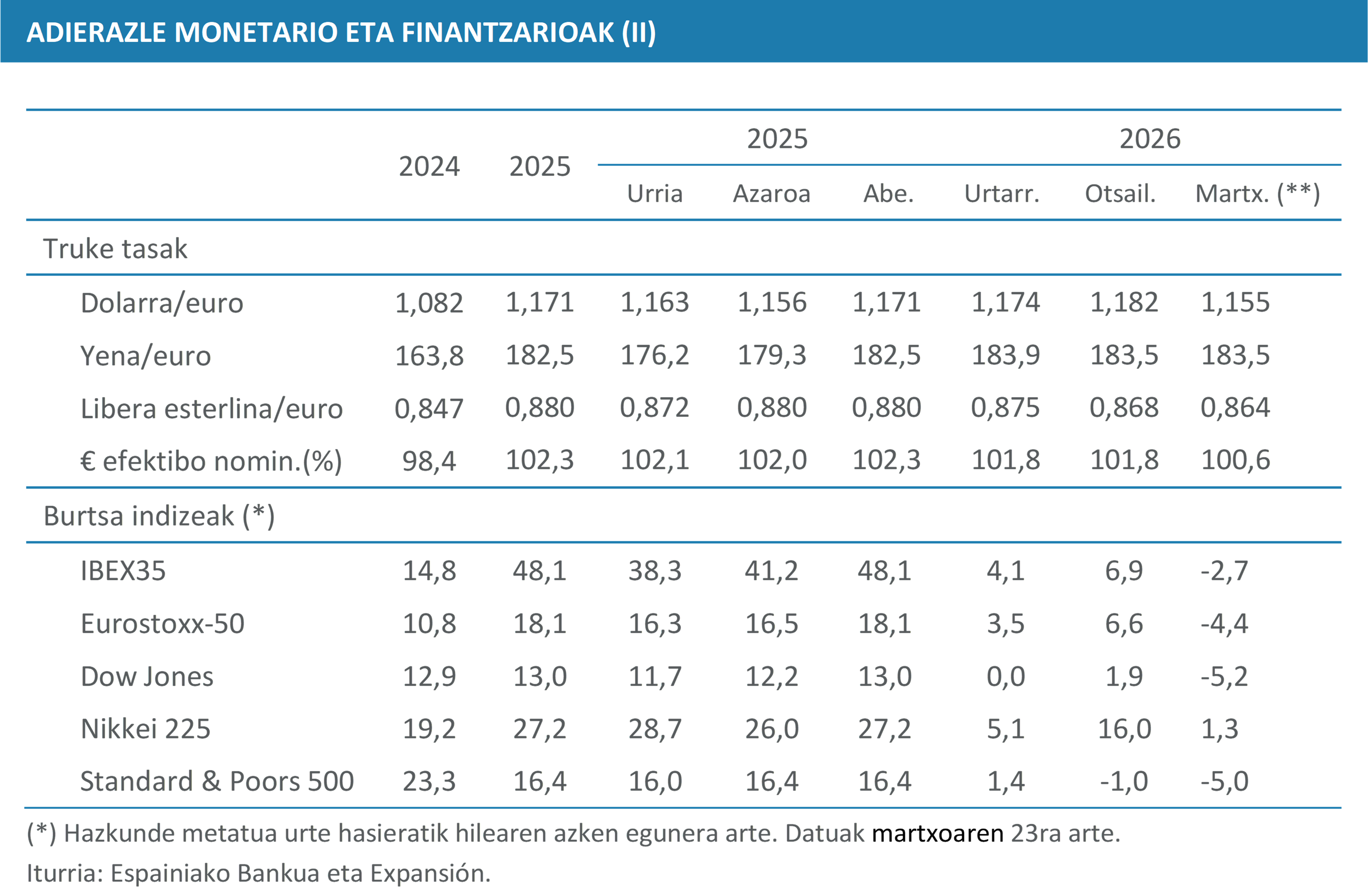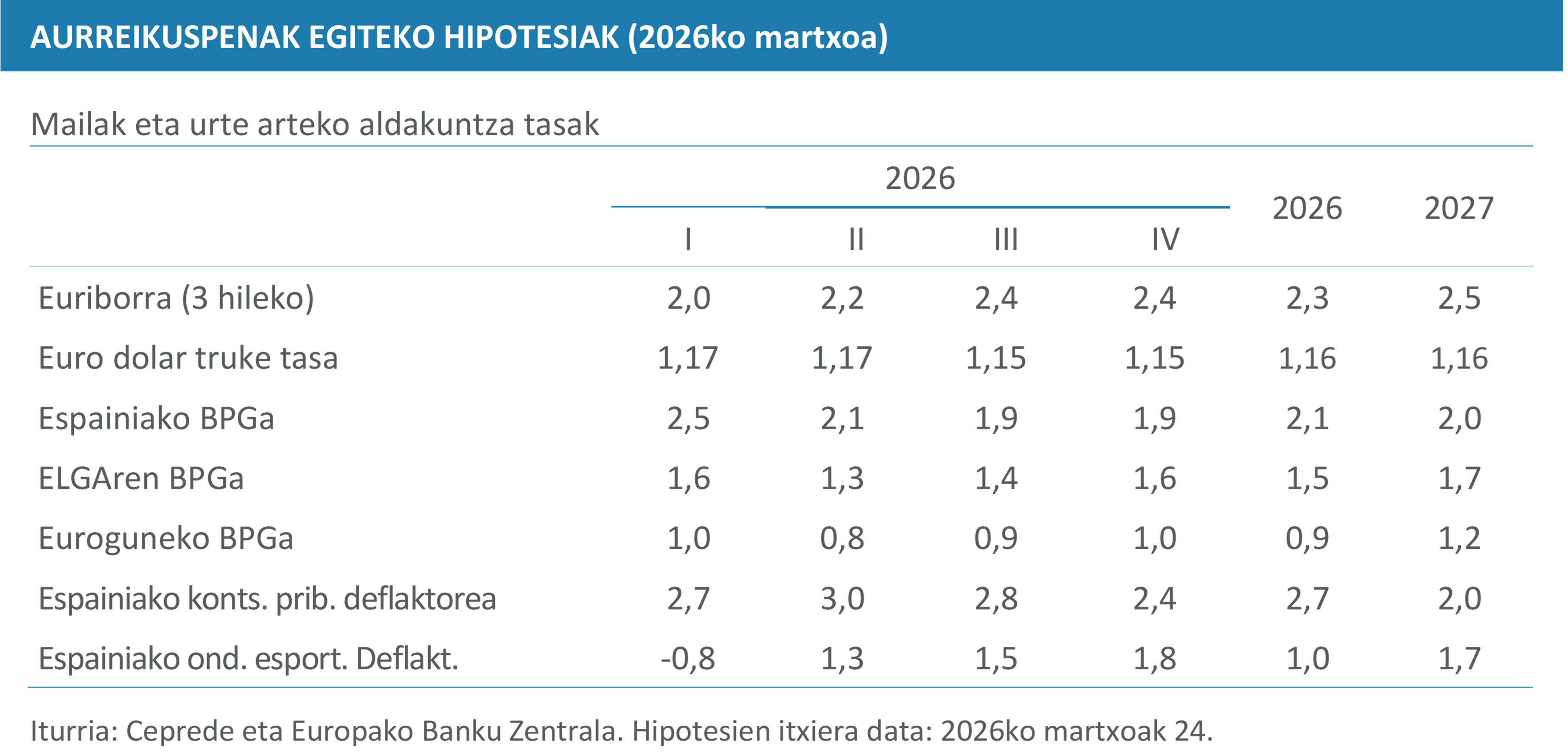 Oraingoz, Europako Banku Zentralak berriki onartu duenaren ildotik, 2026an Euriborrak gora egin du, baina inflazioak EBZren moneta politikako erabakiak apirilean edo ekainean bezain laster alda ditzake. Kanbio tasari dagokionez, onartzen da Irango bonbardaketaz geroztik ikusitako dibisa estatubatuarraren hautemateak aurreikuspen horizontean jarraituko duela, nahiz eta bi ekonomien dinamika ezberdinek dibergentzia bat ekarri moneta politiken zentzuan, baita moneta politikaren helburu berberak ez partekatzeagatik ere. Inguruko ekonomietarako hazkunde aurreikuspenek Espainiako ekonomiaren hazkundearen dezelerazioa eta inguruko gainerako herrialdeen egonkortasuna adierazten dituzte, nahiz eta, jakina, energia shockaren eraginaren araberakoa izango den.