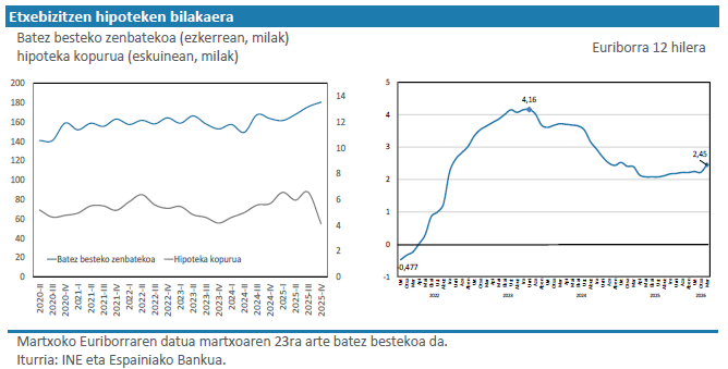 Hipoteken arloan, INEren datuek erakusten dute 2025. urtea nabarmen hedakorra izan zela Euskadin. Ekitaldian zehar, etxebizitzen gaineko 25.505 hipoteka eratu ziren, 2024an baino %22,5 gehiago, hau da, hazkundea izan da bigarren urtez jarraian, eta aurreko urteetako doikuntza-fasearen ondoren, merkatuaren susperraldia berretsi egin da. Hiruhilekoko bilakaera heterogeneoa izan zen: hipoteken kopuruak balio bereziki altuak lortu zituen lehen eta hirugarren hiruhilekoetan, eta laugarrenak, berriz, eragiketa berrien bolumenaren moderazioa ekarri zuen. Zenbatekoari dagokionez, hipoteka bakoitzeko batez besteko kapitala modu iraunkorrean igo zen, 162.000 euro pasatxotik hasi lehen hiruhilekoan eta 180.000 euro ingurura laugarrenean (azken hau serieko maximoa).