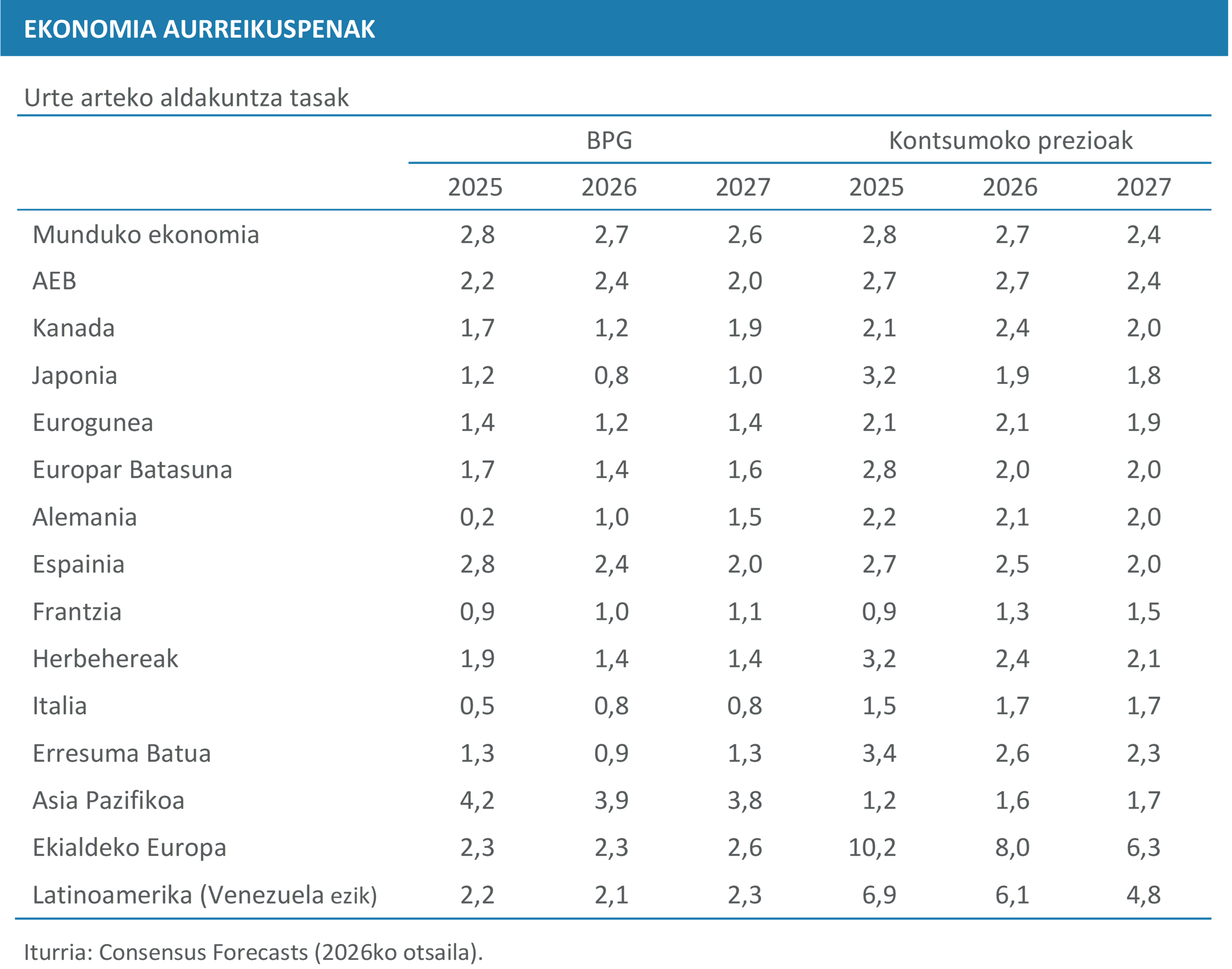 Oraingoz, Erreserba Federalak aurreikusten du AEBetako ekonomia %2,4 haziko dela 2026an eta %2,3 2027an; Consensus Forecast panelaren batez bestekoa, berriz, bat dator 2026rako aurreikuspenarekin, baina 2027koa %2,0ra jaisten du. Sektore teknologikoaren hazkundea moteldu egingo da, baina kontsumoaren eta sektore ez-teknologikoetako inbertsioaren bultzada txikiagoa konpentsatzen jarraituko du. Izan ere, aspalditik aipatzen ari da enpresa teknologikoekiko espektatiben zuzentze baten aukera, bereziki Adimen Artifizialarekin lotutakoak, Estatu Batuentzat beheranzko arrisku nagusietako bat bezala, eta hori gauzatuz gero, 4 hamarren inguruko zuzenketa ekar lezake 2026an munduko hazkundearen oinarrizko agertokiari, NDFren arabera.