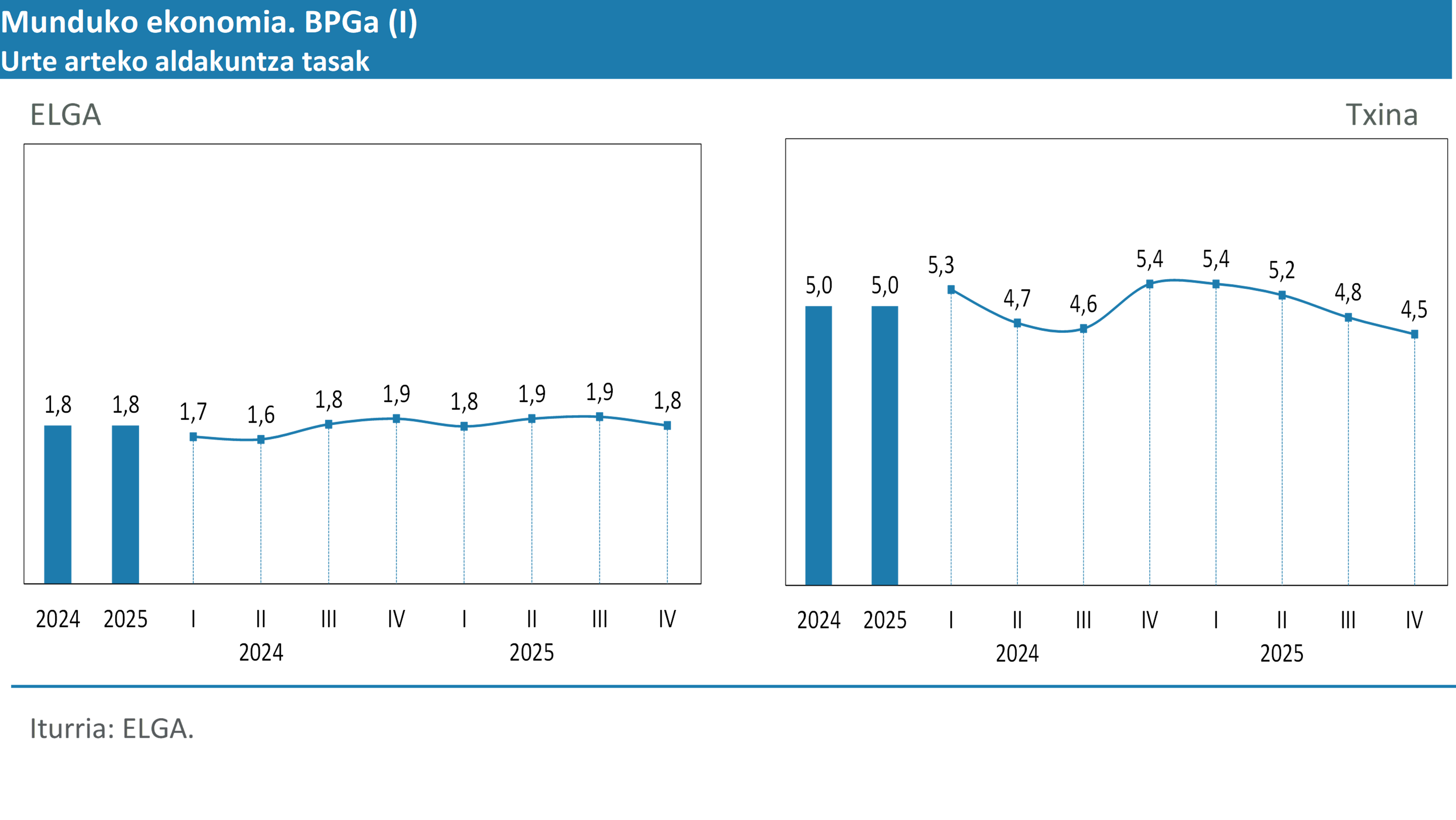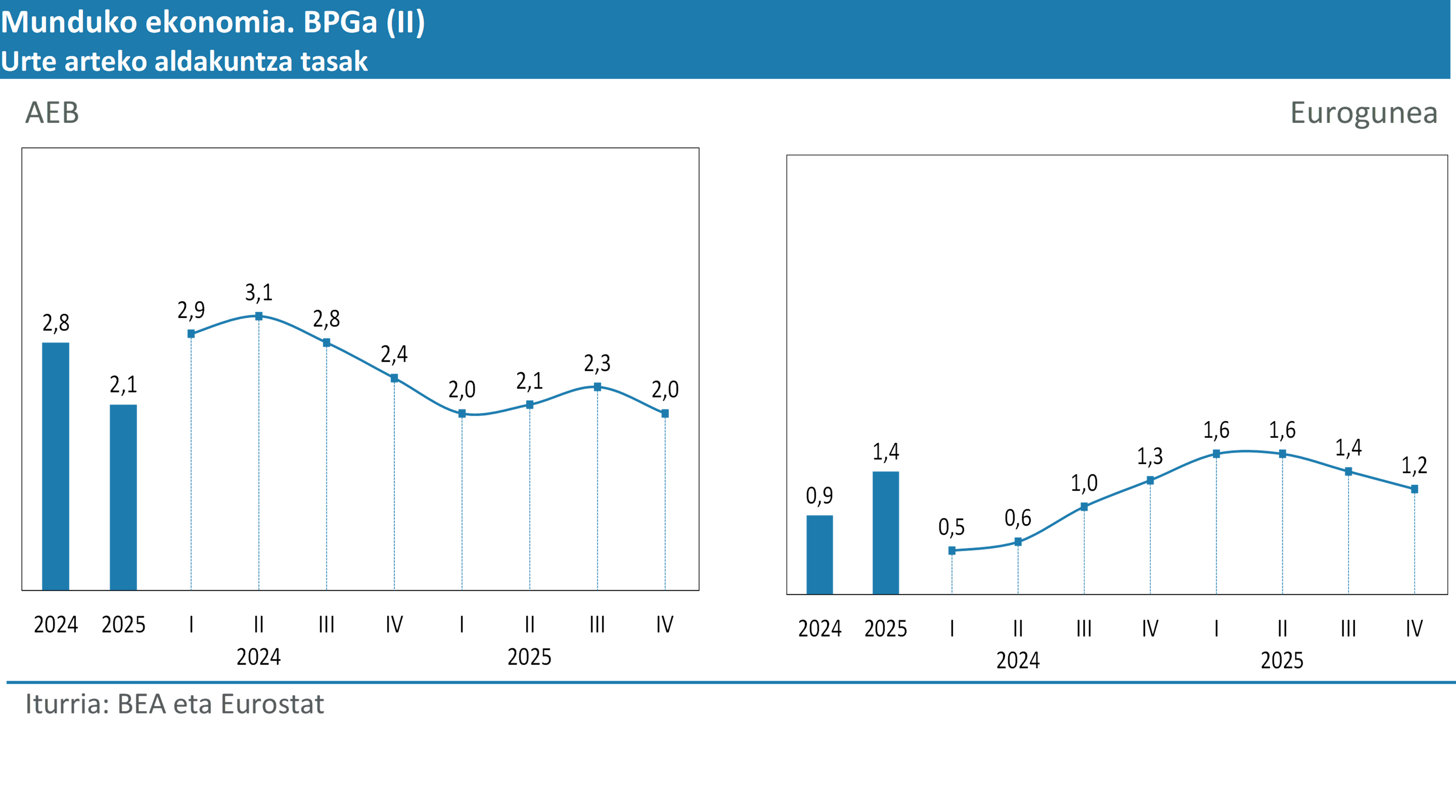 2025eko laugarren hiruhilekoan, munduko ekonomiak hazkunde erritmo egonkorra izan zuen, gorabehera handirik gabe, inflazioaren pixkanakako normalizazioa eta lan merkatuen indarra ezaugarri dituen ingurune batean. ELGAren hazkunde osoa urte arteko %1,8 ingurukoa izan zen, aurreko hiru hiruhilekoetako erregistroen ildotik, eta goraka ari diren ekonomia handiek, berriz, tasa askoz handiagoetan aurrera egiten jarraitu zuten. Tentsio geopolitikoek eta merkataritzakoek hor jarraitzen zuten, baina, urte amaierara arte, jardueran zuten eragina nazioarteko merkataritzaren moderazioaren bidez bideratzen zen nagusiki, eta ez eskariaren bat-bateko geldialdiaren bidez.