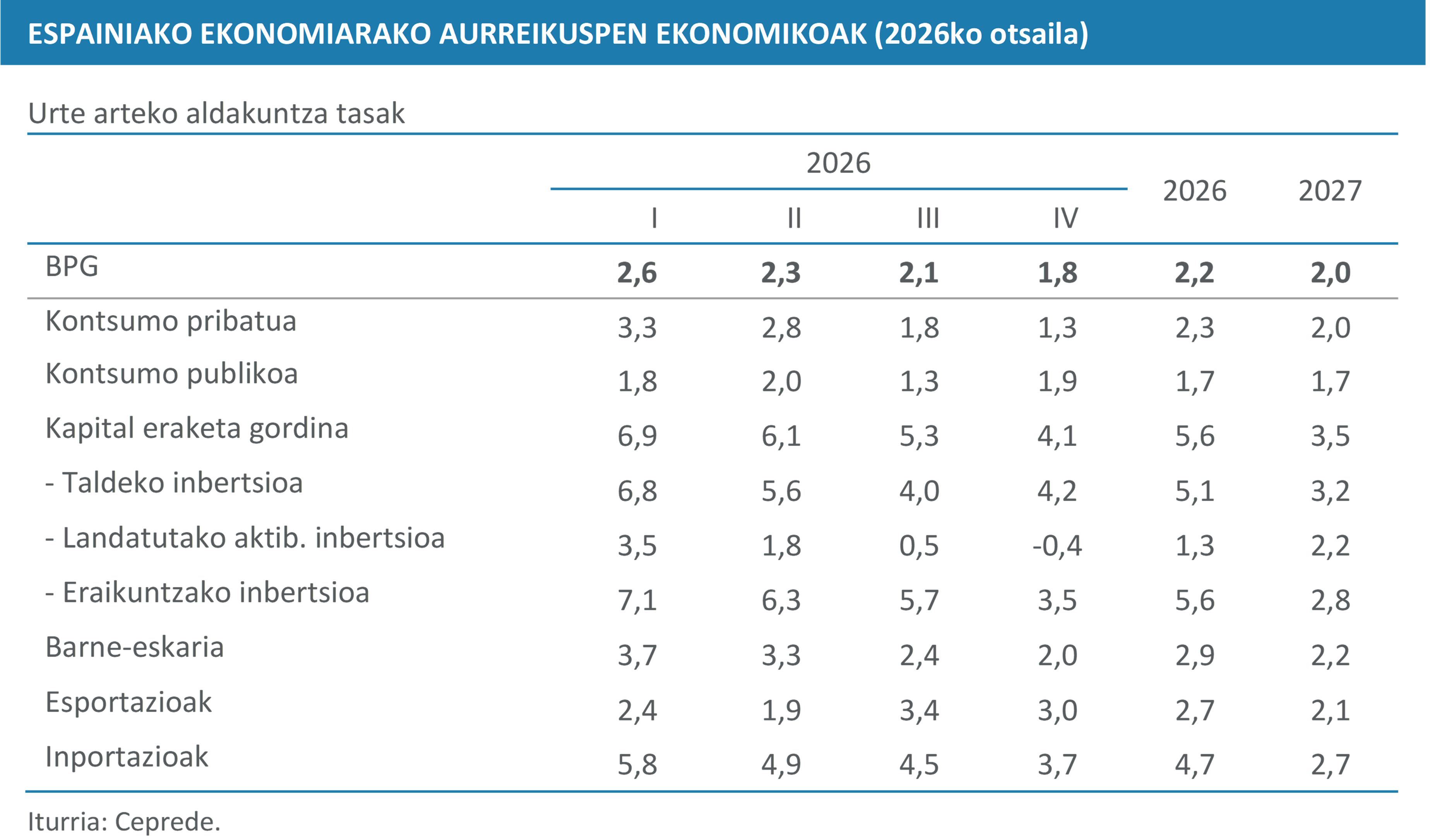 Espainiako ekonomiak 2025ean erakutsitako dinamismoa, %2,8ko hazkundearekin, 2026ko lehen hiruhilekoetan luzatuko dela espero da, kontsumo pribatuari eta inbertsioaren gaineko SEM funtsen bultzadari esker; nahiz eta jada urtearen bigarren erdialderako aurreikusitako dezelerazioa gauzatuko den. Zerbitzuen eskariak sendoa izaten jarraitzen du, baina ingurunearen aldakortasunak ziurgabetasuna gehitzen dio eta industriari baita eragiten dio. Cepredek oraingoz nahiko tonu baikorrari eusten dio, batez ere inbertsioari dagokionez, eta 2026an %2,2ko hazkundea aurreikusten du, 2027an %2,0ra jaitsiko dena. Ondorioz, enpleguak erritmo motelagoan egingo du aurrera, langabezia-tasa %10 inguruan egonkortuta. Nazioarteko Diru Funtsak antzeko bidea aurreratu du, baina ez hain dinamikoa: 2026an %2,1ko igoera, eta 2027an %1,8koa; eta inflazioa urte amaieran %3ra irits daitekeela aurreikusten dute.