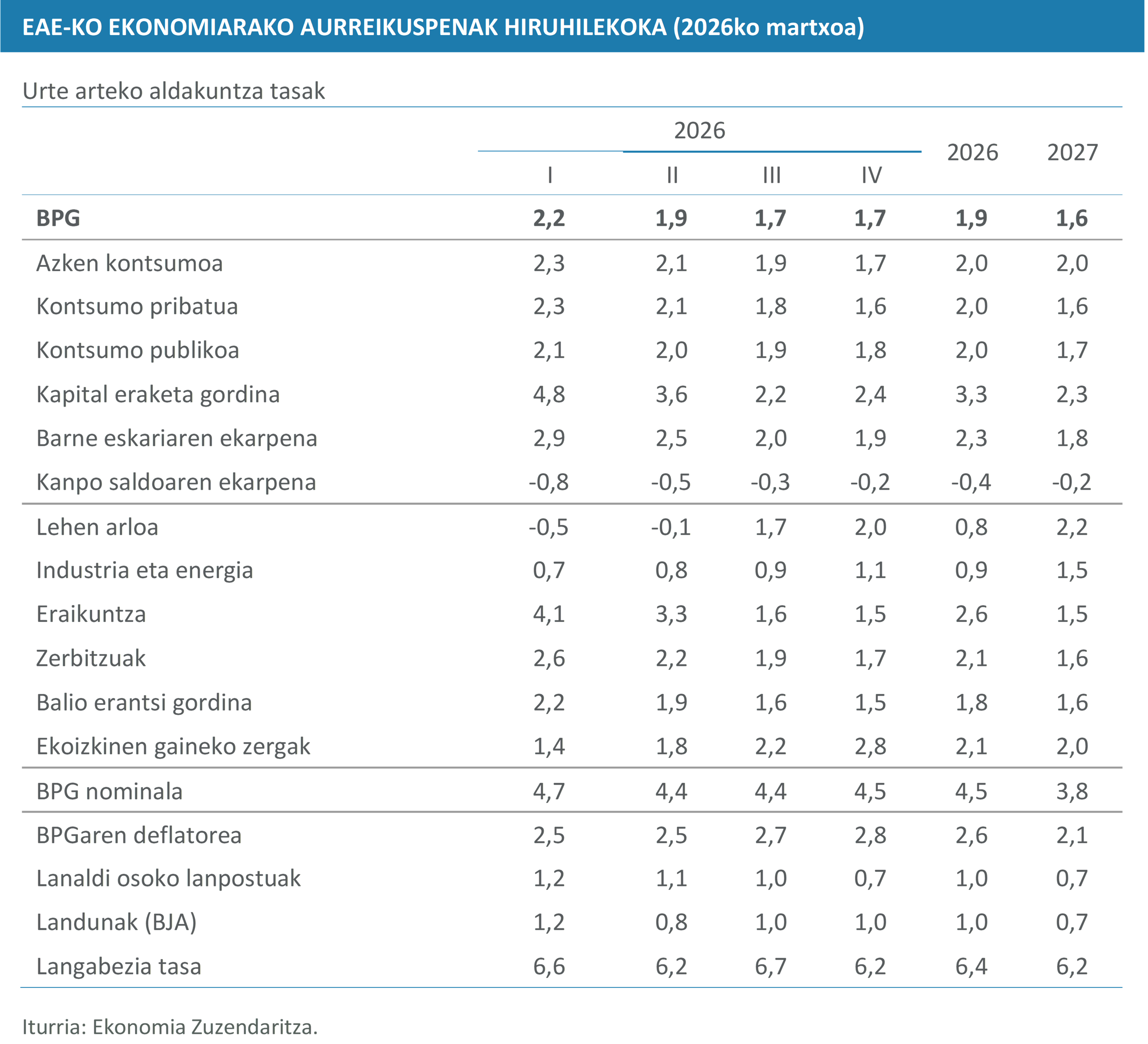EAEko ekonomiak 2026rako BPGaren urte arteko %2,2ko hazkunde ibilbidea izango du lehen hiruhilekoan, eta moteldu egingo da, leun, urteko hurrengo hiruhilekoetan; horrek %1,9ko hazkundea ekarriko du 2026an. Duela hiru hilabete baino testuinguru txarragoa izan arren, barne eskariaren bultzadari esker urtearen azken txanpan izandako bilakaera sendoari esker, euskal ekonomiak hazten jarraituko du 2026an, erritmo nabarmenean.