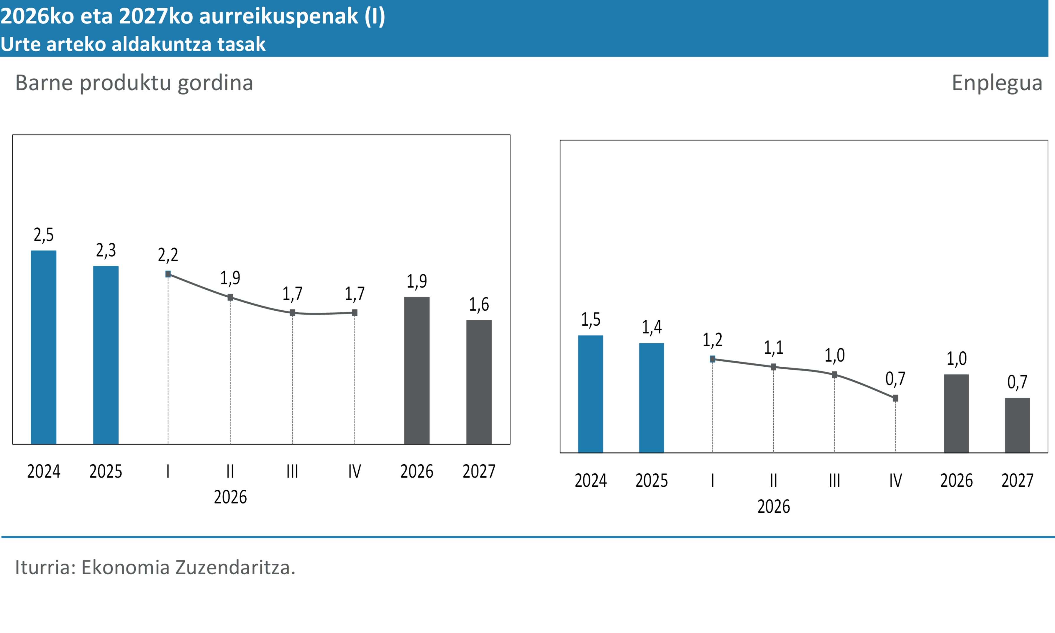 Egoeraren araberako informazio berrienari eta testuinguru hipotesien eguneratzeari esker, 2026rako eta 2027rako egoera makroekonomikoa zehaztu daiteke. Erdiko agertokia jarraitutasun suposizioetan egiten da, gatazkaren ondoriozko shock gehigarririk gabe. Esparru horretan, BPGa urte arteko %2,2 haziko litzateke 2026ko lehen hiruhilekoan, eta pixkanakako moderazioa izango luke, 2026an %1,9ko batez besteko hazkundera eta 2027an %1,6ra arte. Enplegua %1,0 igoko litzateke 2026an eta %0,7 2027an, langabezia tasa %6,4ra eta %6,2ra murriztuta, hurrenez hurren. Prezioei dagokienez, aurreikusten da BPGaren deflatorea %2,6 haziko dela 2026an, eta %2,1era jaitsiko dela 2027an.