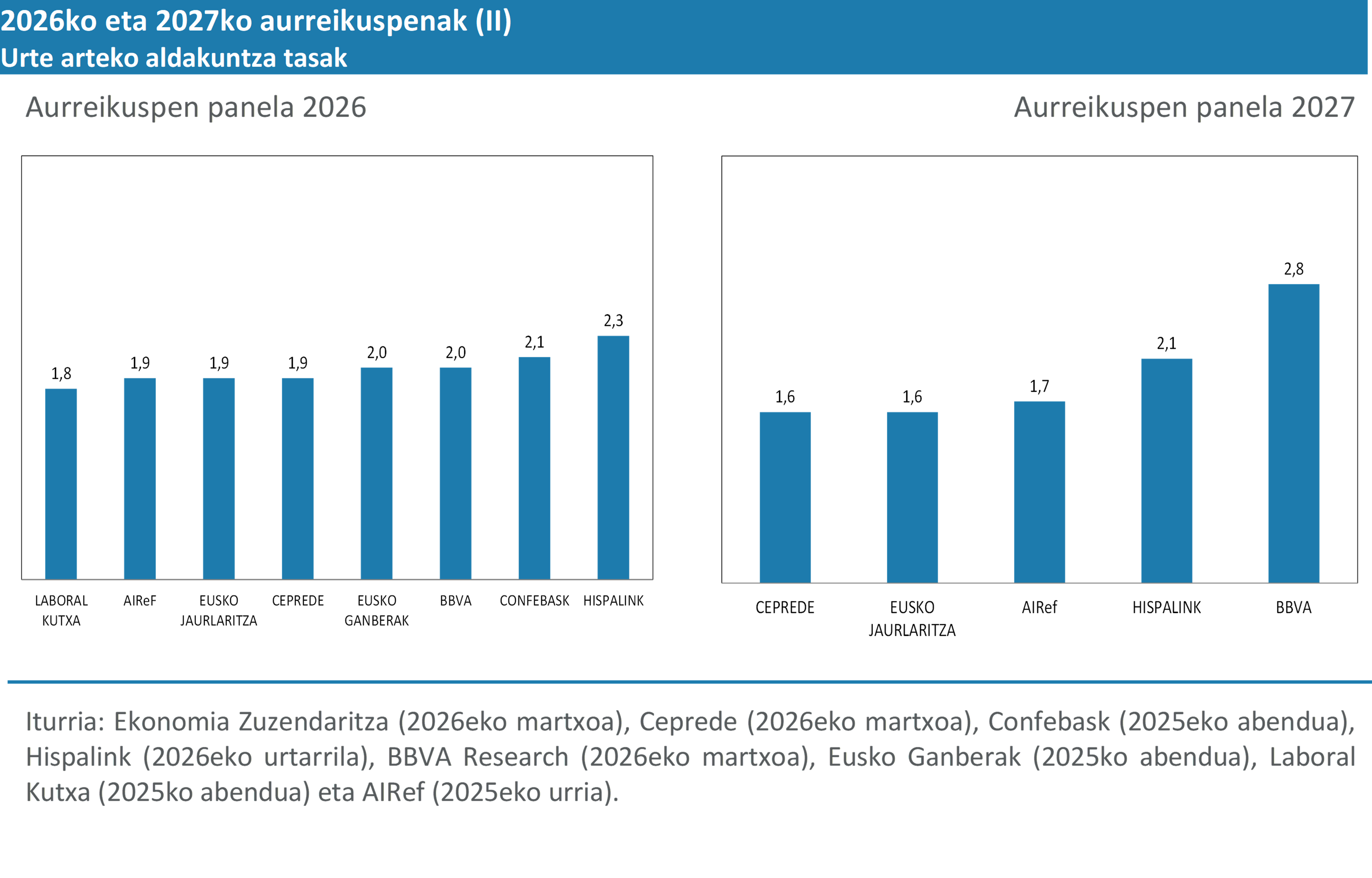 2026-2027 aldirako euskal ekonomiaren aurreikuspenak egiteko erabilitako hipotesiak muturreko ziurgabetasunean formulatzen dira, Ekialde Hurbileko gatazka dela eta. Gatazkaren intentsitatea eta, batez ere, iraupena zehazteko ezintasunak zaildu egiten du gatazkaren garapen posible oro bide makroekonomiko zuhurra proiektatzeko agertoki nagusi gisa hartzea; horrela, martxoko lehen asteetan jada gertatutakoaren ondorioak hartu dira kontuan koadro makroekonomikoa egiteko. Aurreikuspenen ariketa osatzeko, eta gatazkaren atariko fasea dela eta, eraginaren zenbatespen ariketa bat egin da, aurreikuspen honen ondoren datorrena, eta emaitzak shocka garatzeko bide posibleetara estrapola daitezke.