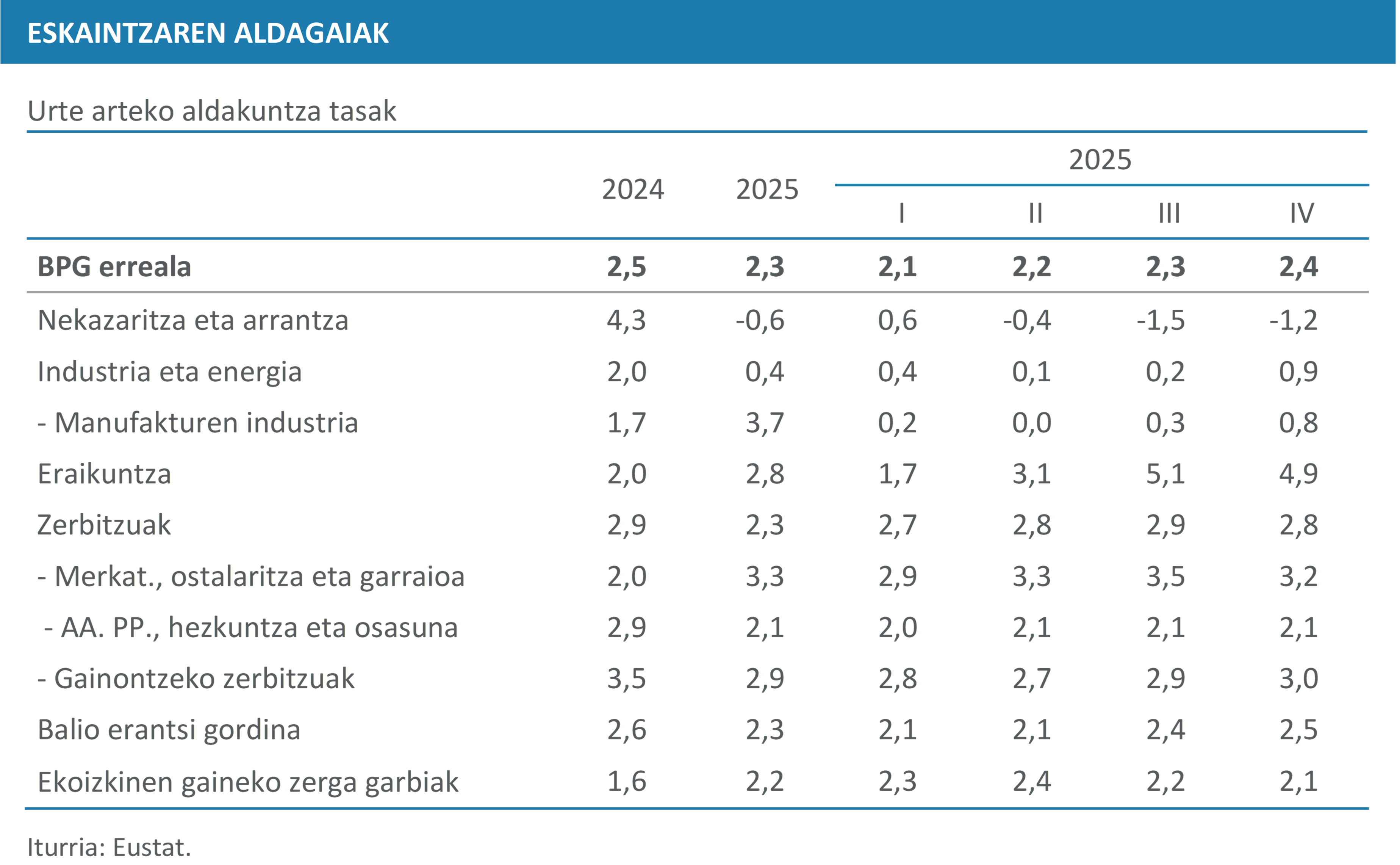 Zerbitzuak izan ziren berriz ere hazkundearen eragile nagusia. 2025ean, oro har, balio erantsia %2,8 igo zen, urtean zehar erritmo egonkorra izan zuen eta hiru jarduera bloke handietan oinarritu zen. Merkataritzaren, ostalaritzaren eta garraioaren indarra nabarmendu zen, %3,3ko aurrerapenarekin, aurreko ekitaldikoa baino nabarmen handiagoa. Sektore publikoari gehien lotutako adarrek ere portaera sendoa eta jarraitua izan zuten, urte osoan %2tik gorako hazkundeekin.