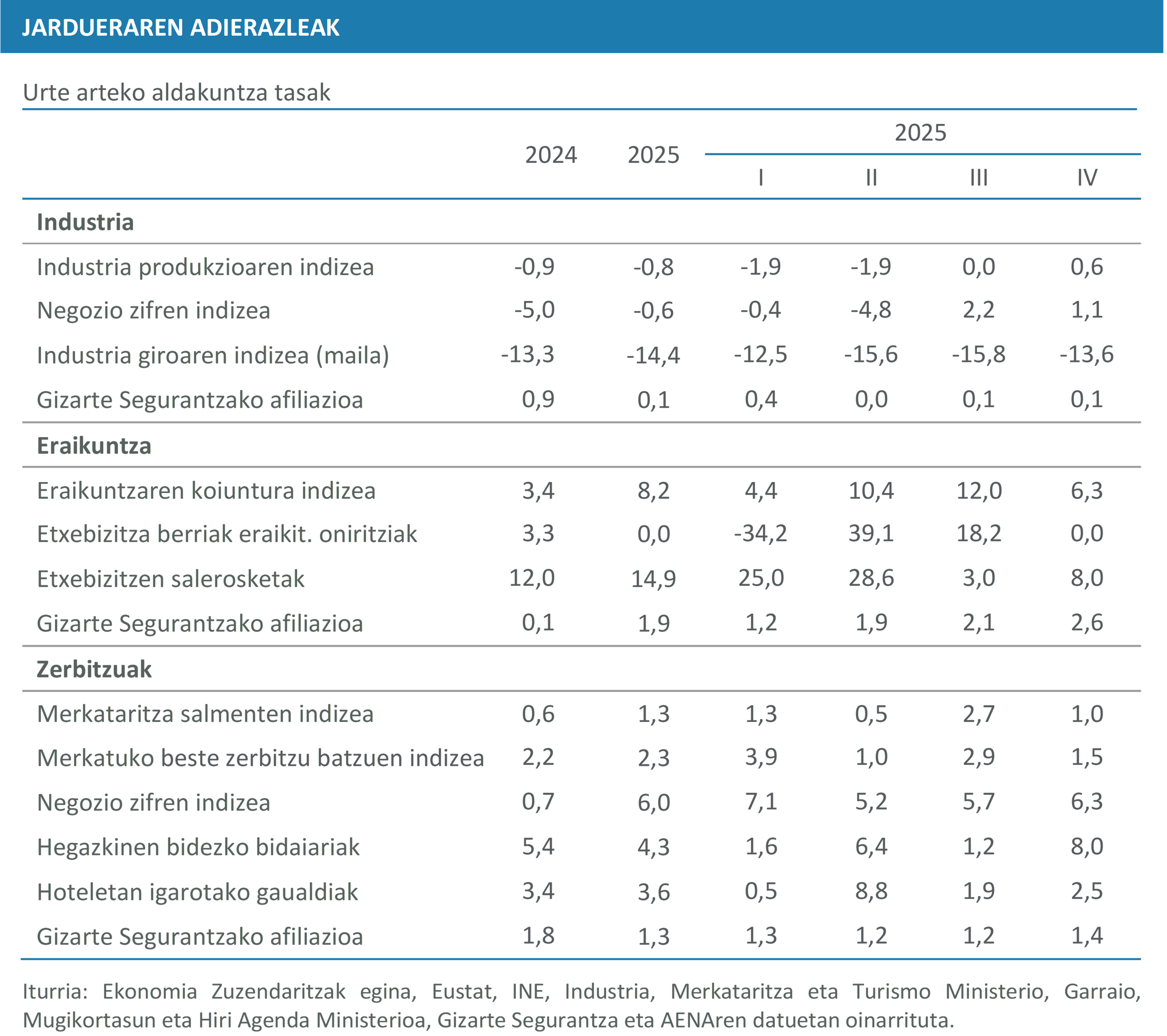 EAEko ekonomiak %2,4ko hazkundea izan zuen 2025eko laugarren hiruhilekoan, urtea aurrerapen iraunkorrekin amaituz, eta Ekonomia Zuzendaritzak aurreikusitakoa baino portaera apur bat hobea berretsiz. Hiruhilekoko kontabilitateak barne trakzio handien duten sektoreetan oinarritutako hazkunde patroi bat nabarmentzen du, zerbitzuen, ekitaldian zehar erritmo sendo eta egonkorra mantendu zutenak, eta eraikuntzaren rol protagonistekin, inbertsioari lotutako bultzada gehigarria ekarri baitzuen. Industriak, nazioarteko testuinguruaren eraginpean, gorakada nabarmena izan zuen urtearen azken zatian, zenbait hiruhilekotan hazkunde ia laua izan ondoren. Barne portaera hobe honen aurrean, kanpo saldoaren ekarpena hazkundeari kentzen jarraitu zuen, Europako bazkide batzuen ahultasunak eta merkataritza tentsioek baldintzatuta, nahiz eta aurreko ekitaldietan baino osaera aldekoagoa izan.
