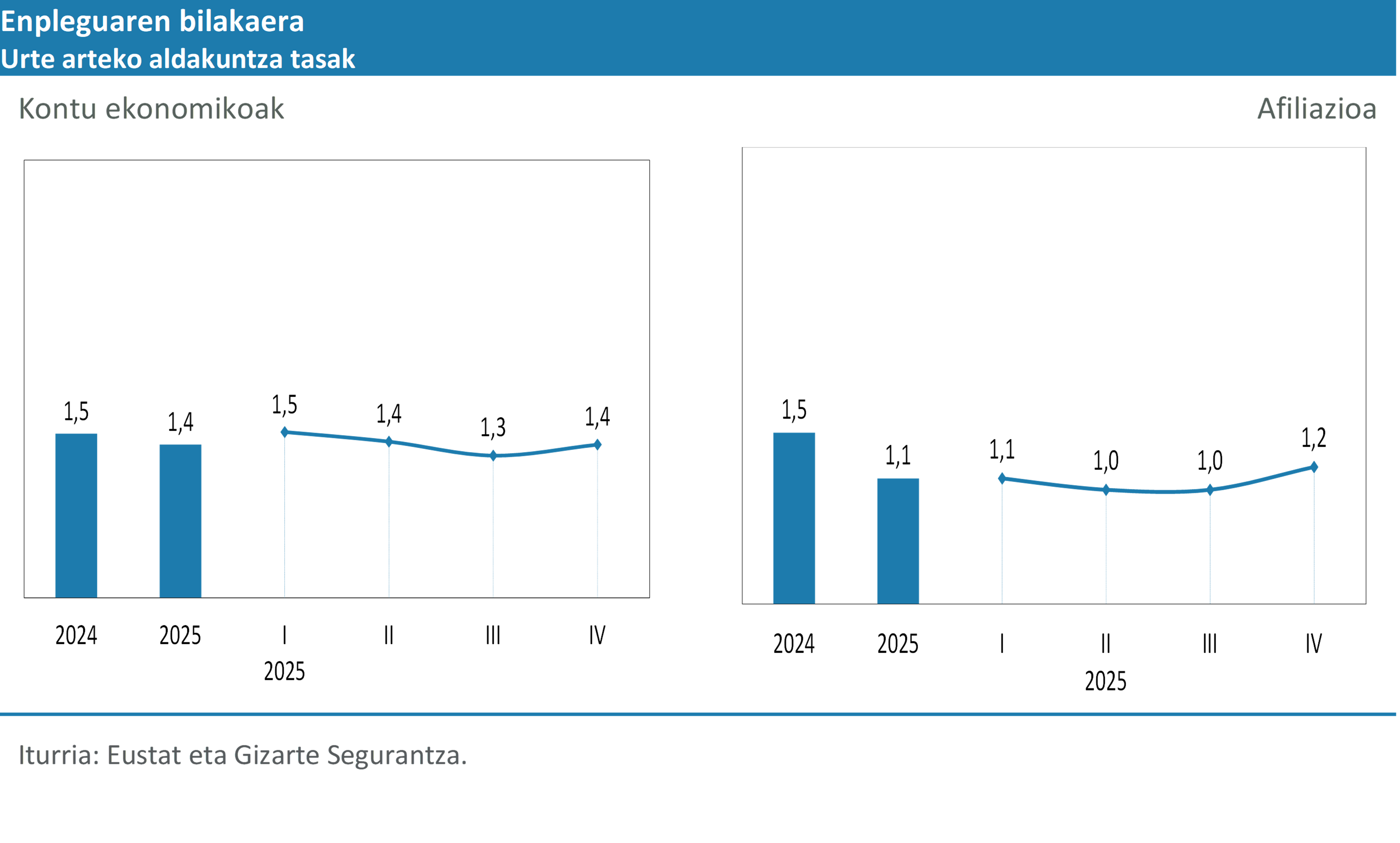 Jardueraren bilakaera positiboa lan merkatura eraman zen, 2025ean enpleguaren %1,4ko hazkundearekin itxi baitzen, aurreko urteko erritmoaren hamarren bat azpitik eta oraindik ere maila sendoetan. Aurrerapen horren ondorioz, lanaldi osoko 14.000 lanpostu baliokide inguru sortu ziren. Hiruhilekoaren profilak hasiera bereziki dinamikoa izan zuen, %1,5eko hazkundearekin lehen hiruhilekoan, eta %1,4 inguruan egonkortu zen urtearen amaierara arte. Laugarren hiruhilekoan, lanpostuen guztizko kopurua milioitik gorakoa izan zen, eta estatistika serie osoko mailarik altuenera iritsi zen, zerbitzuetan kontzentratutako enplegu sorkuntzaren zati handi batekin.