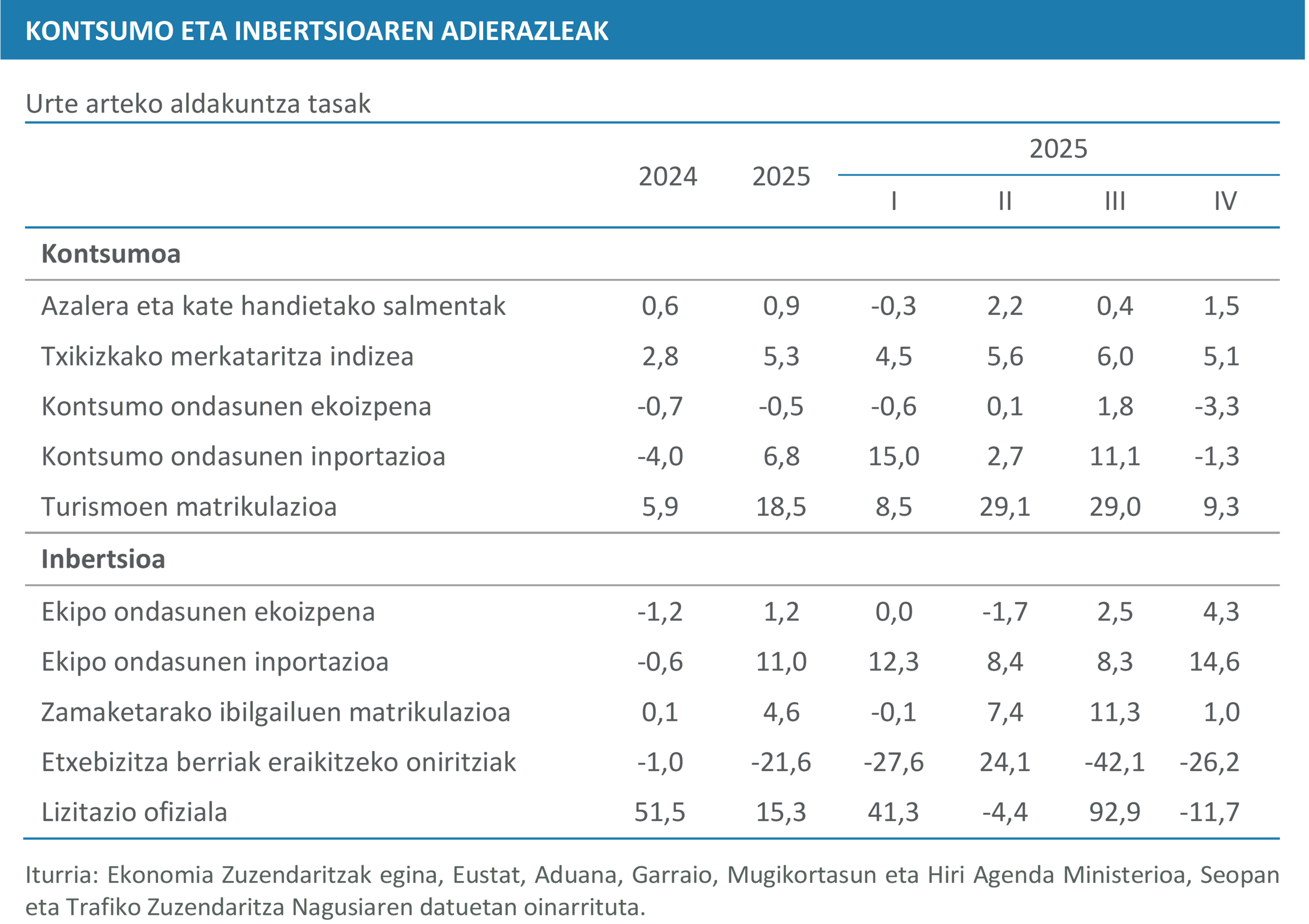 2025ean, oro har, Euskadik bere hazkundeari eutsi zion, bere barne eskariaren sendotasunean oinarrituta. Urteko ibilbidea sendoa izan zen; urtearen hasieran ikusitako hazkunde patroia urte amaiera arte mantendu zen, eta kontsumoaren eta inbertsioaren arteko osaera egonkorra izan zen. Kanpoko sektorearen ekarpena berriz, aurreko etapetan baino nabarmen txarragoa izan zen.