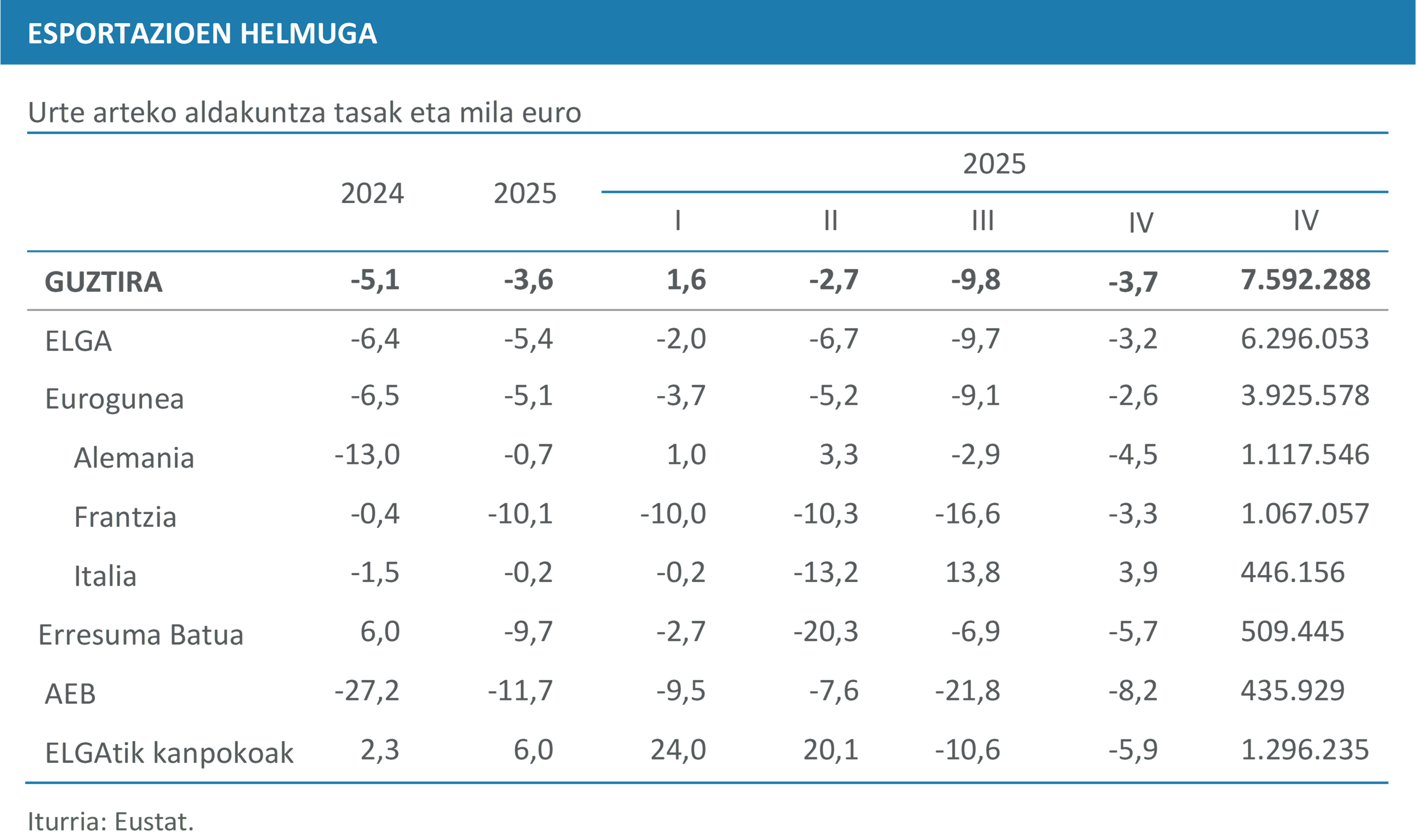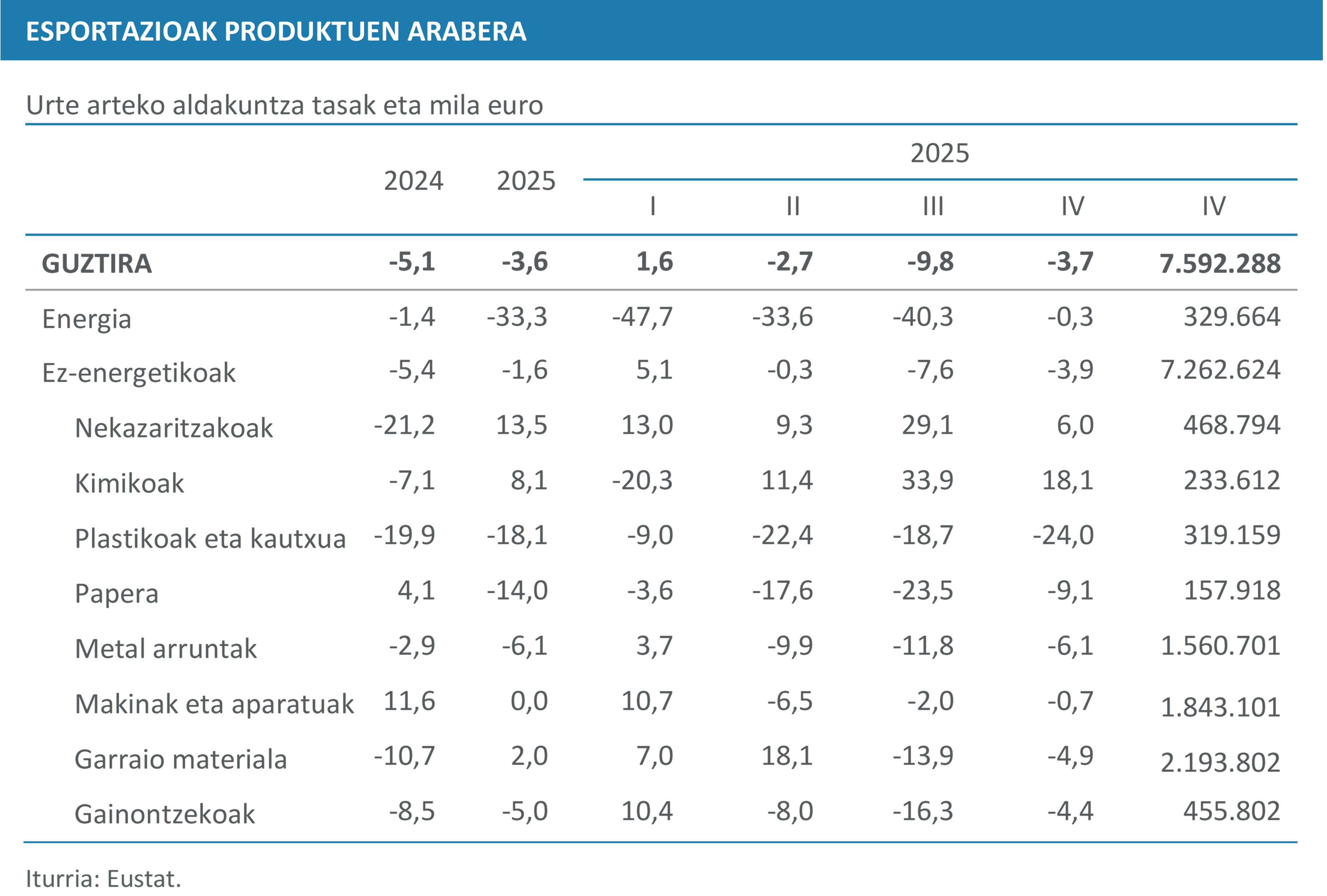 Eustaten informazioaren arabera, ondasunen atzerrirako esportazioak %3,6ko beherakada izan zuen 2025ean, aurreko urtean baino murrizketa apalagoa (-%5,1). Lehen hiruhilekoan oraindik positiboa izan ondoren, gainerako hiruhilekoetan jaitsiera jarraituak izan ziren. Laugarren hiruhilekoan, urte arteko aldakuntza -%3,7 izan zen, guztira 7.592 milioi euro salduta. Atzerritik etorritako ondasunen inportazioek ere behera egin zuten, baina apalago (-%1,1), 6.573 milioi euro guztira.