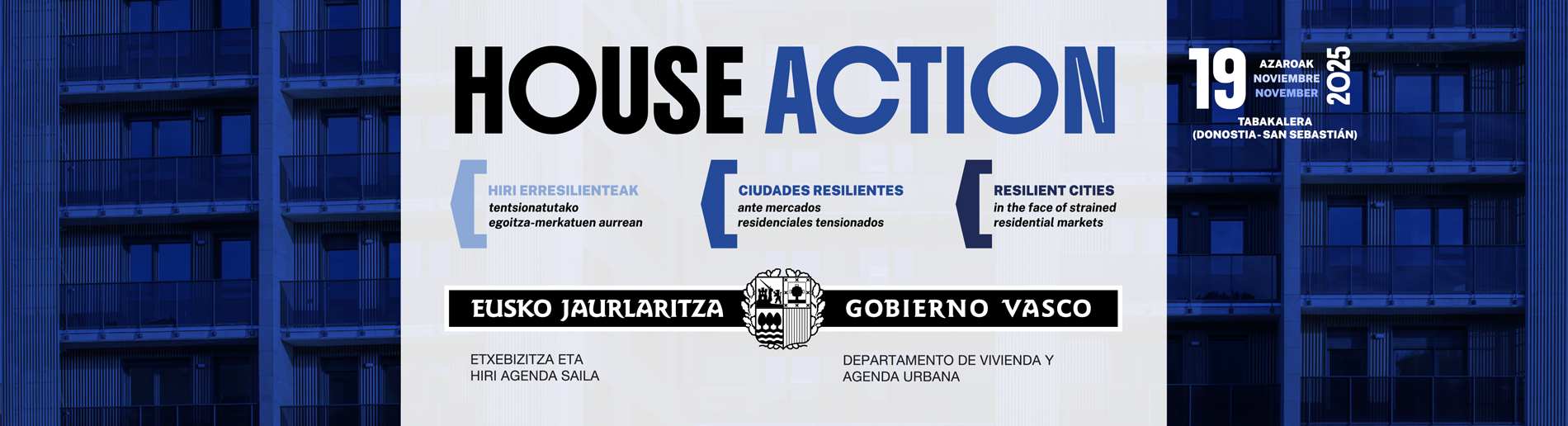 Eusko Jaurlaritzako Etxebizitza eta Hiri Agenda Sailak ‘House Action: Hiri erresilienteak tentsionatutako egoitza-merkatuen aurrean’ I Nazioarteko Kongresuaren lehen edizioa egingo du. Topagune berri honek etxebizitzaren inguruko eztabaidaren Europako epizentro bihurtuko du Donostia azaroaren 19an Tabakaleran.