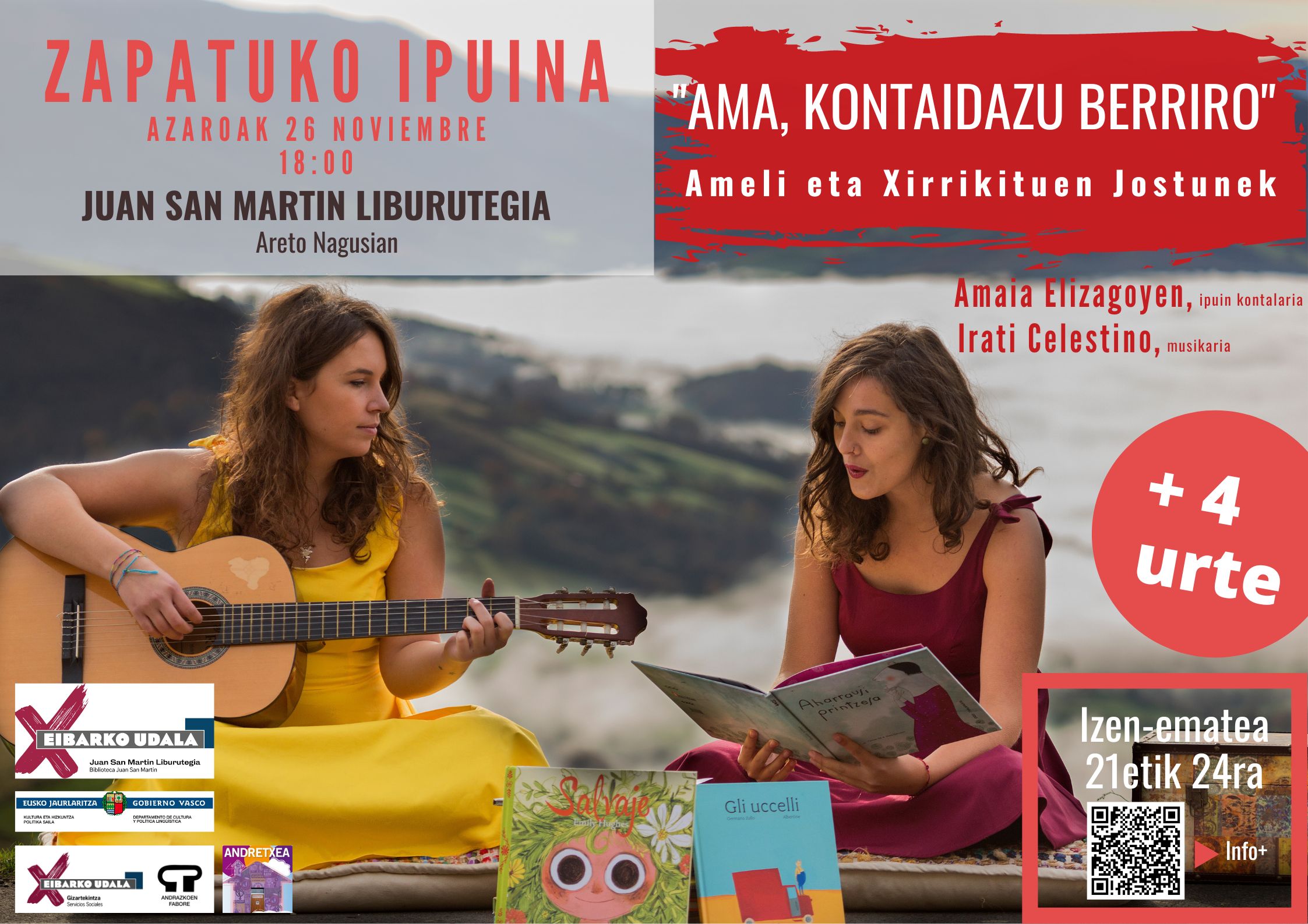 Ameli eta Xirrikituen jostunek. Ipuin kontaketa musikatuak. Amaia Elizagoyen ipuin kontalaria eta Irati Celestino musikaria.