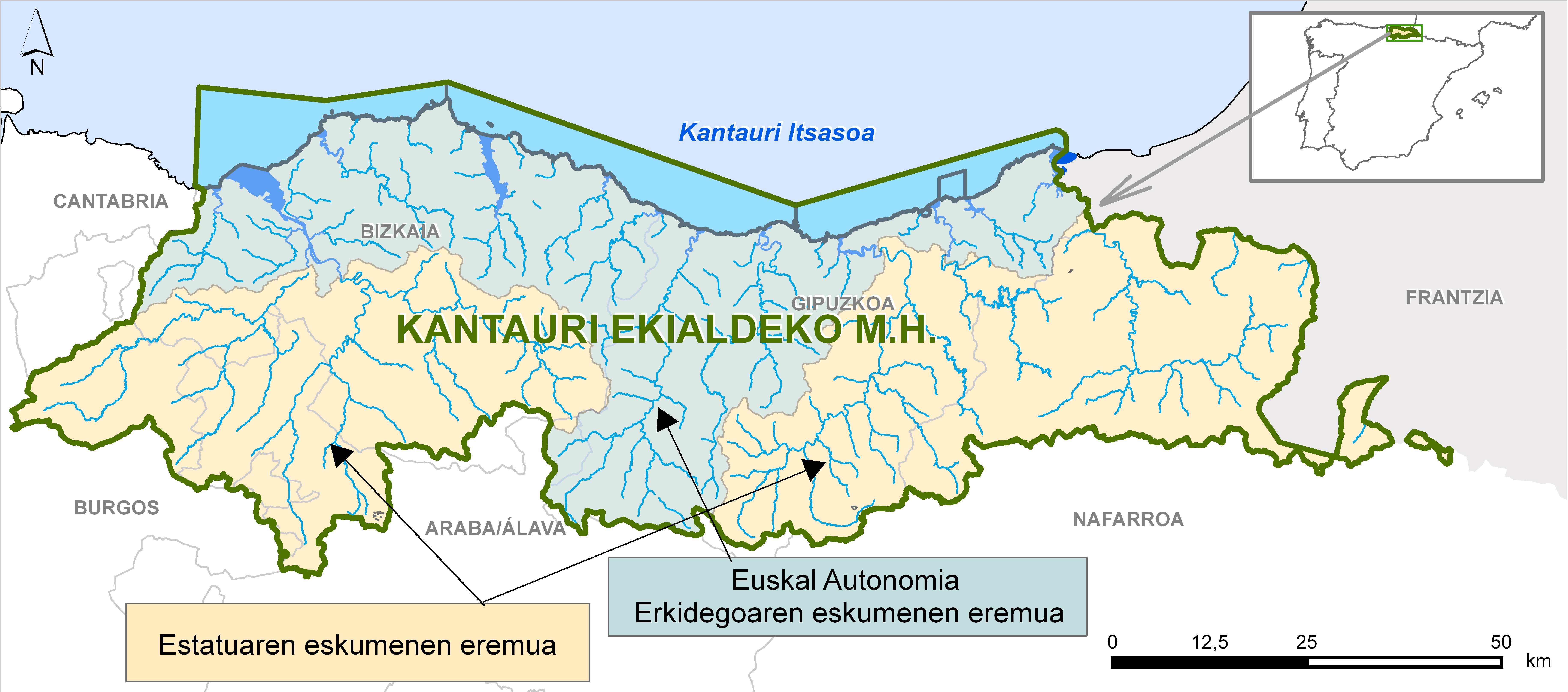 Batetik, Euskal Autonomia Erkidegoaren eskumen-eremua, hau da, Barneko Arroak, bertako plangintza Uraren Euskal Agentziaren ardurapean dagoena eta, bestetik, Estatuaren eskumen-eremua, hots, Erkidego arteko Arroak, plangintza Kantauriko Konfederazio Hidrografikoaren esku dagoena.