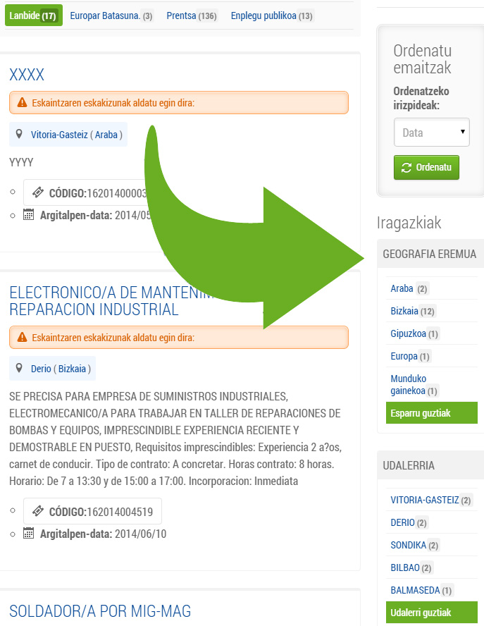 Iragazkiak ikastaroen eta eskaintzen zerrendetan. Orain, ezarri diren iragazkiekin, nabigatzea eta enplegua eta ikastaroak bilatzea askoz errazagoa da. Egin zure bilaketa, eta iragazpen-elementu guztiak zure esku izango dituzu.