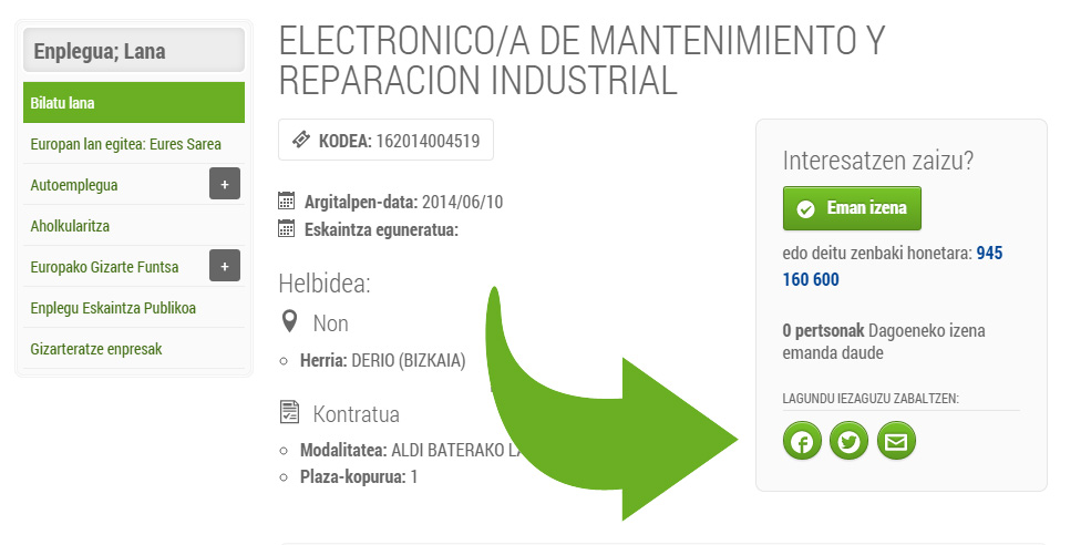 Lanbidenet-ek sare sozial nagusiekin konektatzen zaitu, zure lagun eta kontaktuekin informazioa partekatu dezazun. Partekatu eskaintzak eta ikastaroak Facebook eta Twitterren.