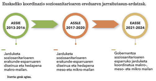 Egungo EAEko Arreta Soziosanitarioko Estrategiak (2021-2024), arreta soziosanitarioaren eredua artikulatzen emandako mende laurdenari jarraipena emanez, esku hartzeko mailen, makro (erakundeartekoa), meso (antolamenduzkoa) eta mikro (asistentziala), bat etortze estrategikoa sustatzen du, antolaketa-eremuaren laguntza ezinbestekoarekin eta herritarren eta hirugarren sektorearen parte-hartzearekin, EAE osoan lehen mailako arreta soziosanitario, efiziente eta efikaza hedatzeko.
