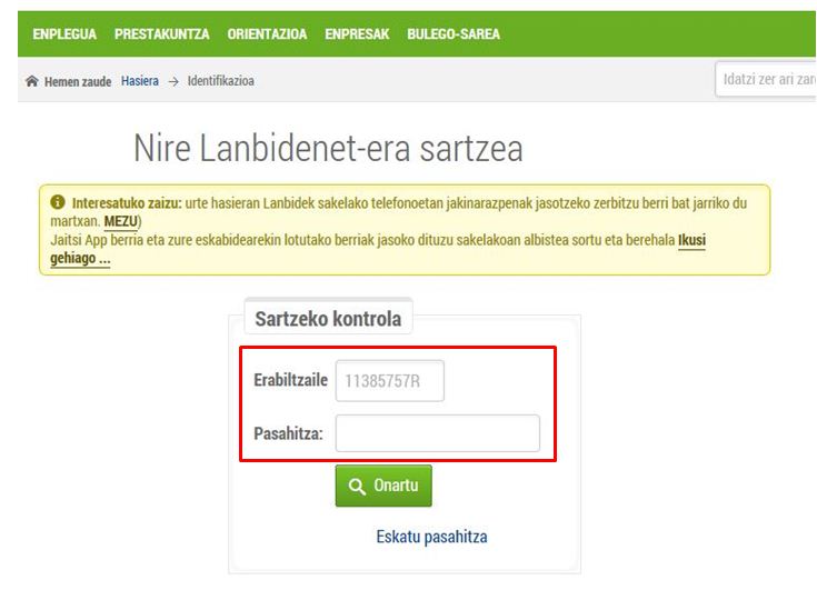 1.- Sakatu Nire Lanbidenet botoia, webgunearen goialdean. Identifikazio-pantaila agertuko zaizu. Hor sartu behar dituzu Lanbidek eman dizkizun IFZ eta pasahitza