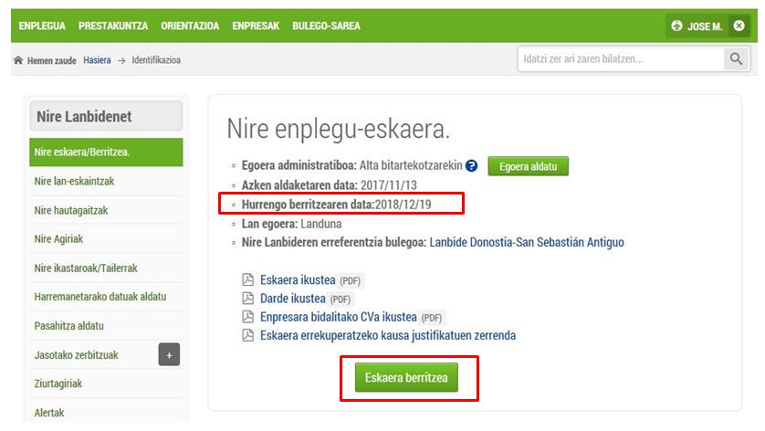 Oro har, eskaria 3 hilean behin berritu behar duzu, zure DARDEn (eskaera-eskatzaileari alta emateko eta hura berritzeko agiria) edo DARSEn (zerbitzu-eskatzaileari alta emateko eta hura berritzeko agiria) zehazten den egunean. Data hori nahiz duzunean kontsulta dezakezu, Nire Lanbidenet-en sartuta. Baina eskaria berritzeko ilaretan zain egon edo bulego batera joan nahi ez baduzu, deitu telefonoz (945 160 600 edo 630 305 452), bidali SMS bat edo sartu webguneko Nire Lanbidenet atalean. Honako hauek dira jarraitu beharreko urratsak:
