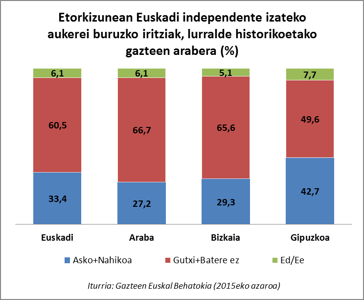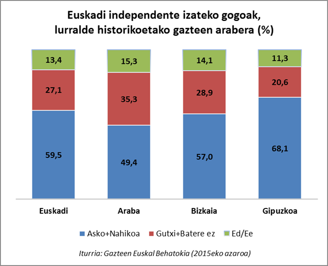 2015eko azaroan Euskadiko 15 eta 29 urte bitarteko gazteen lagin adierazgarri bati galdetu genion zenbateraino nahi zuten Euskadi independente izatea. Gazteen % 34,7k adierazi zuten gogo handiz nahi zutela hori eta beste % 24,8k nahikoa gogoak zituztela hori lortzeko, beraz esan dezakegu Euskadin hamar gaztetik seik (% 59,5) independentzia nahi dutela.