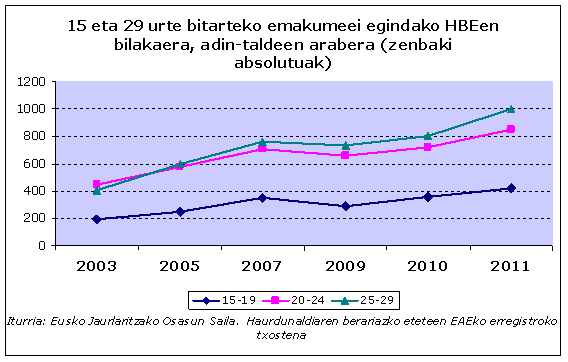 Datu horien arabera, 2011n, 2270 HBE egin zitzaizkien emakume gazteei, EAEn egindako HBE guztien (4138) % 45. Emakume gazteek HBE guztien artean hartzen duten pisuak behera egin du zertxobait 2007tik (HBE guztien % 61 gazteei egin zitzaizkien).