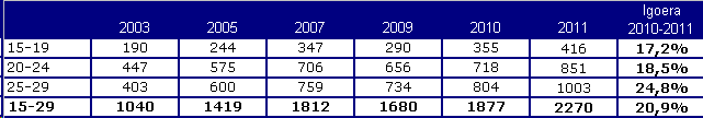 2011n gazteei egindako HBEetatik gehienak (% 44) 25 eta 29 urte bitartekoei egin zitzaizkien, % 38 20 eta 24 urte bitartekoei eta % 18 gazteenei.
