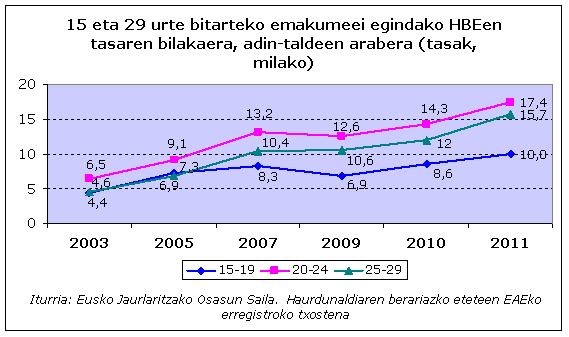 HBEen tasetan goranzko joera antzeman daiteke adin-talde guztietan. Tasarik handiena 20 eta 24 urte bitarteko emakumeena da (‰ 17,4); baxuena, ordea, 15 eta 19 urte bitartekoena da (‰ 10,0).