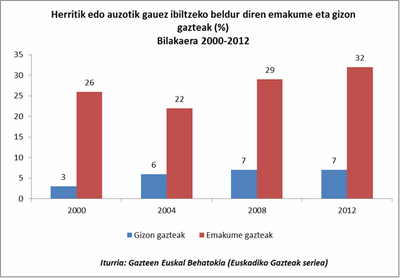 15 eta 29 urte bitarteko emakumeen heren bat bere herritik edo auzotik gauez ibiltzearen beldur da. Gizon gazteen % 7 daude egoera berean