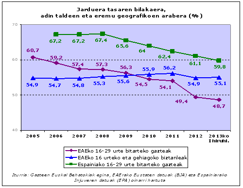 Euskadiko gazteen jarduera tasa jaitsiz joan da azken urteotan: 2005ean % 60,7koa zen eta % 48,7koa 2013ko hasieran. 16 urteko eta adin horretatik gorako biztanleen jarduera-tasa konstantea izan da azken urteotan, gutxi gorabehera, gazteena ez bezala.