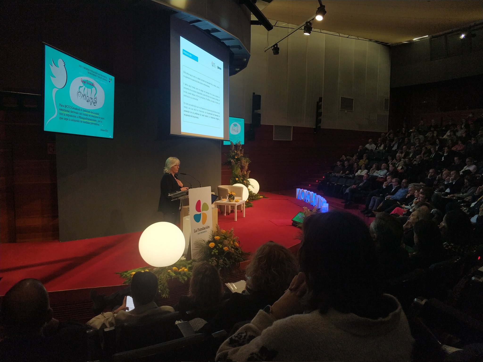 Lourdes Íscar Osalaneko zuzendari nagusiak eman dio ongietorria Kongresuari, eta adierazi du, Euskadin, Euskadiko osasun-inkestak (EAEOI 2018) agerian uzten duela langileen osasun mental txarraren prebalentzia handia: % 37,3 gizonentzat eta % 42,5 emakumeentzat. Langileen osasun mentala okertzen laguntzen duten faktoreak gehiegizko lan-kargak, erritmo altuak eta lankideen arteko harremanak dira.
