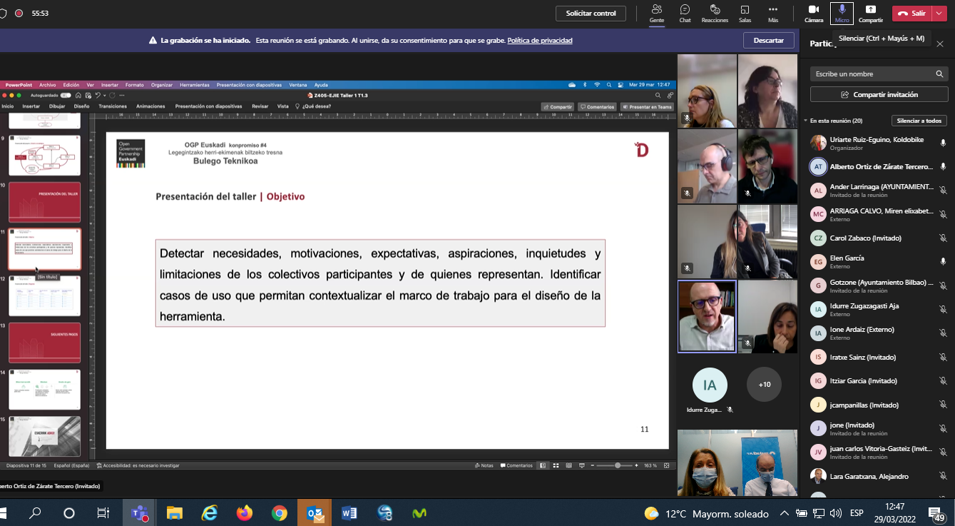 | Zehaztea noraino iritsiko den azkenean. (Herritarrek parte hartzeko hurbileko ekimenei buruzko erabakia, hala nola eskatzeko eskubidea eta tokiko, foru-aldundiko edo autonomia-erkidegoko araudian jasotako beste batzuk). Esperientzia digitala zein pertsona-taldetan oinarrituko den eta zein ez identifikatzea, zerbitzuen diseinuaren ikuspegitik. 1.TAILERRA | Amaituta | ||
