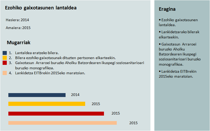 Ezohiko gaixotasunen lantaldearekin (EGL) lankidetza-bilerak antolatzea eta sustatzea egungo egoeraren eta etorkizuneko erronken diagnostikoa egiteko. Gaixotasun Arraroei buruzko Aholku Batzordean parte hartzea. Aholku Batzordearekin lankidetzan aritzea gaixotasun arraroak dauzkaten pertsonen arreta soziosanitarioari buruzko monografikoan; lan horretan garrantzi berezia ematen zaie arreta goiztiarrari eta arreta soziosanitarioaren eta hezkuntzaren arteko koordinazioari. Halaber, EITBk 2015ean gaixotasun arraroen ikerketaren inguruan antolatutako maratoian parte hartzea.