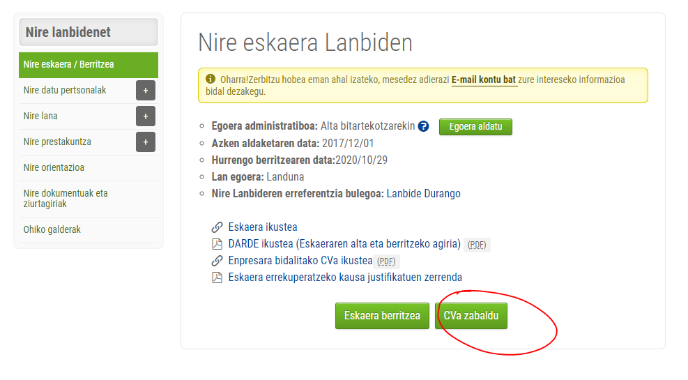 Horretarako, "Nire eskaera / Berritzea" pantailan "CVa zabaldu" botoia topatuko duzu, zure CVaren publizitatea handitzeko.