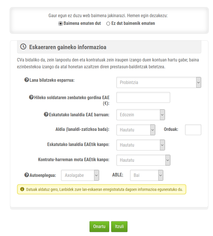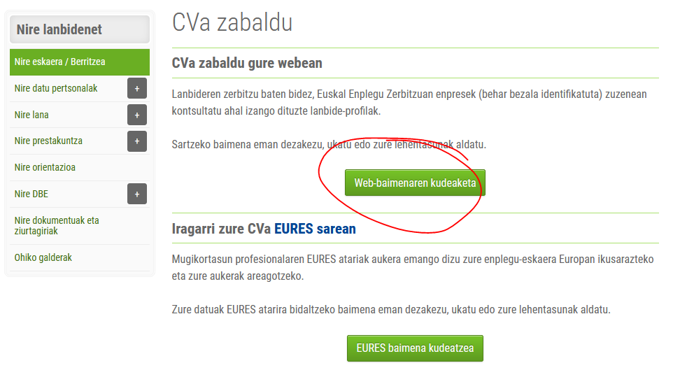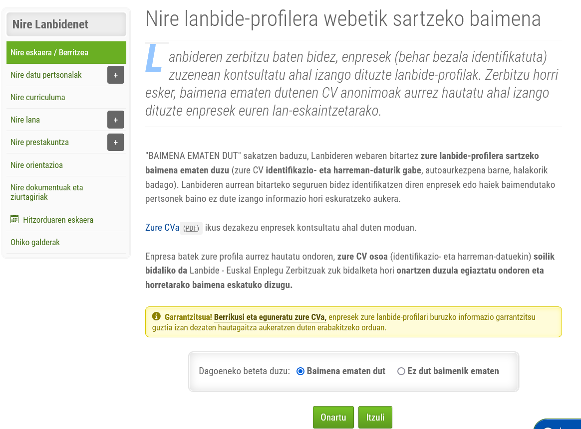 - Web baimenaren zerbitzu, enpresek beren profila kontsultatu ahal izan dezaten (datu pertsonalik gabe) eta, eskaintza baten kudeaketa eskatzean, zuzenean hautagai gisa sar ditzaten, bidalketa hori onartzen duzula egiaztatu ondoren.