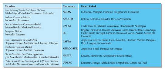 Merkataritza Askerako Gune edo Akordioa: akordioa sinatzen duten herrialdeen arteko barne muga-zergak ezabatzea dakar, baina bakoitzak bere kanpo-merkataritza politikari eusten dio akordioa sinatu ez duten herrialdeekin dituzten harremanetan.