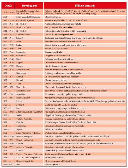 Gai honetan azaltzen den koadroan ikusten denez, planetako toki askotan erabili dira praktika genozidak. Plangintza zorrotzen bidez eta zigorraren beldurrik gabe egiten dira.