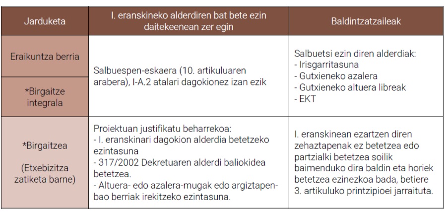 * Etxebizitza berriak sortzeko erabilera-aldaketa birgaitze edo birgaitze integraltzat hartuko da, kasuaren arabera. Birgaitze integrala izango da, baldin eta, aldi berean, eraikinaren egitura egokitzeko, funtzioak egokitzeko eta inguratzaile osoa hobetzeko jarduerak egiten badira, IV. eranskineko definizioaren arabera.