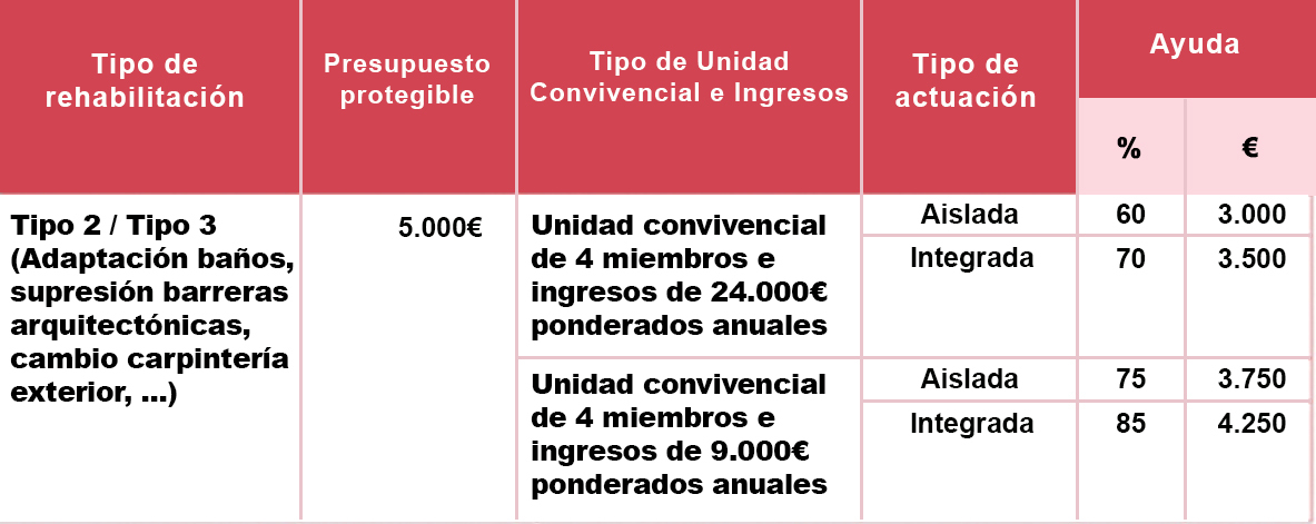 Ejemplo 1: (rehabilitación aislada) una familia de cuatro miembros con ingresos de 24.000 € anuales ponderados, tendría una subvención del 60% del presupuesto protegible para la supresión de barreras arquitectónicas, adaptación de baños o sustitución de carpintería exterior Suponiendo que el presupuesto protegible de 5.000 € la ayuda asciende hasta los 3.000 €. Este incremento supone la que familia tendría que aportar 2.000 €.