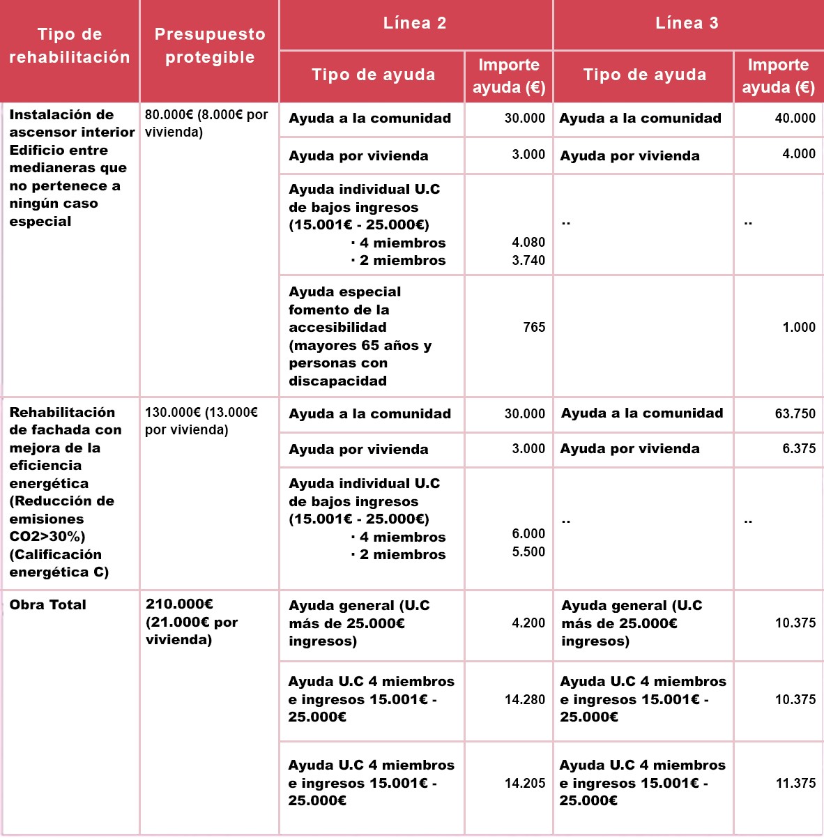 Ejemplo 3: Rehabilitación de la fachada con mejora de la eficiencia energética (reducción de emisiones de CO2> 30%). La ayuda máxima se sitúa en el 40% del presupuesto protegible con un máximo de 50.000 € para actuación. Las unidades convivenciales que no superen los 25.000 € ponderados anuales pueden optar a ayudas individuales.